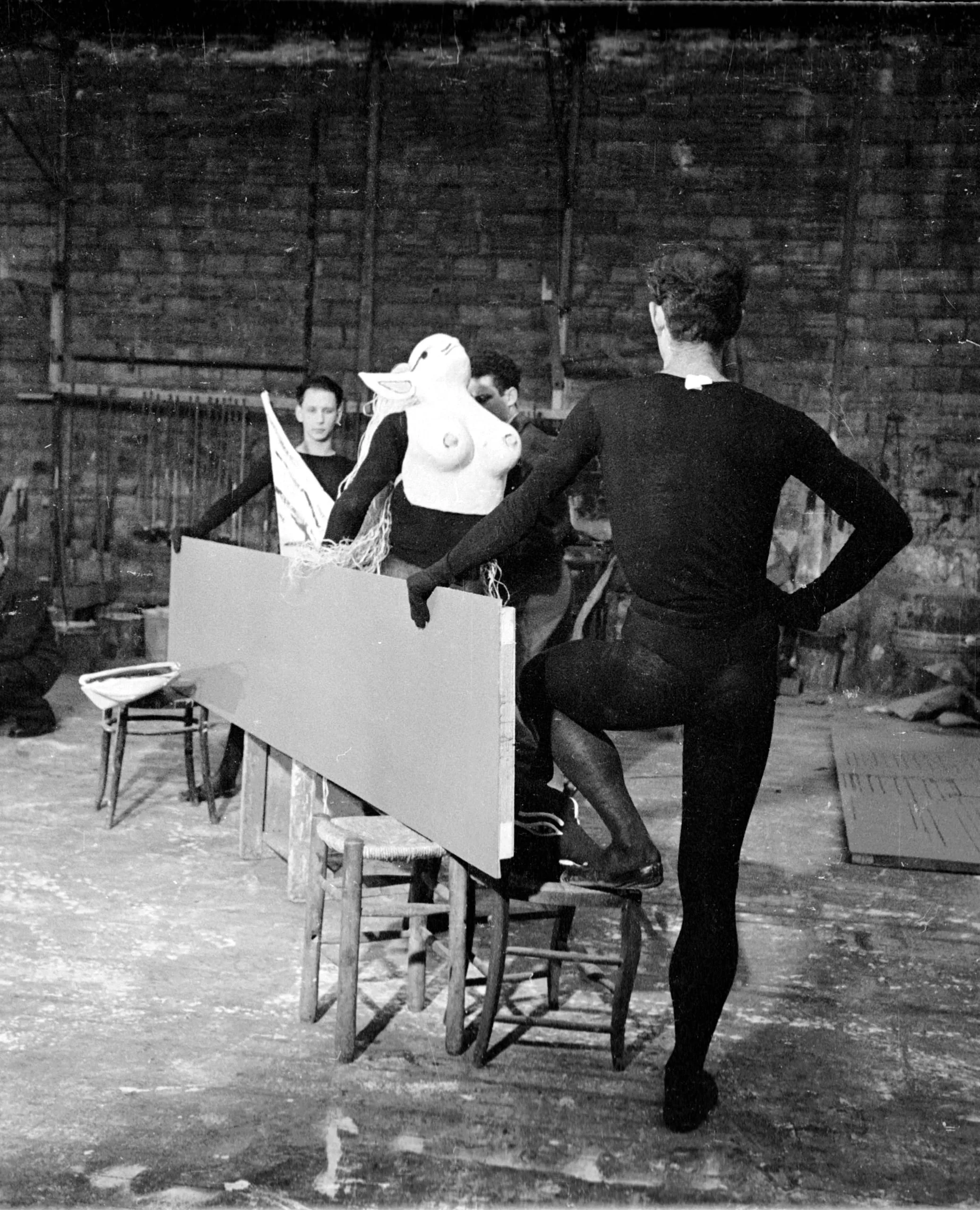 Black and white photograph of three figures in a warehouse space, one in a black bodysuit viewed from behind, another operating a white bird-masked sculptural prop over a panel resting on chairs