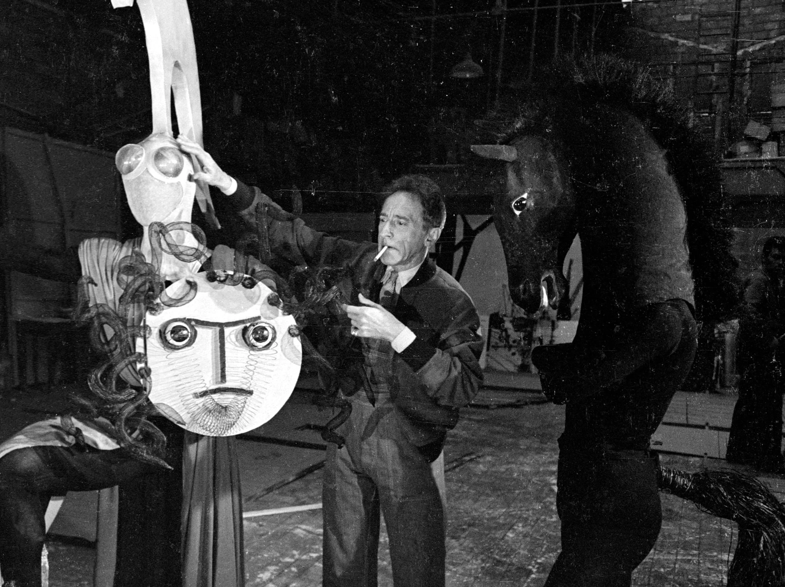 Black and white photograph of a man with a cigarette gesturing toward a large mask-like sculptural face, with a horse-head sculpture looming to his right, in a dimly lit studio