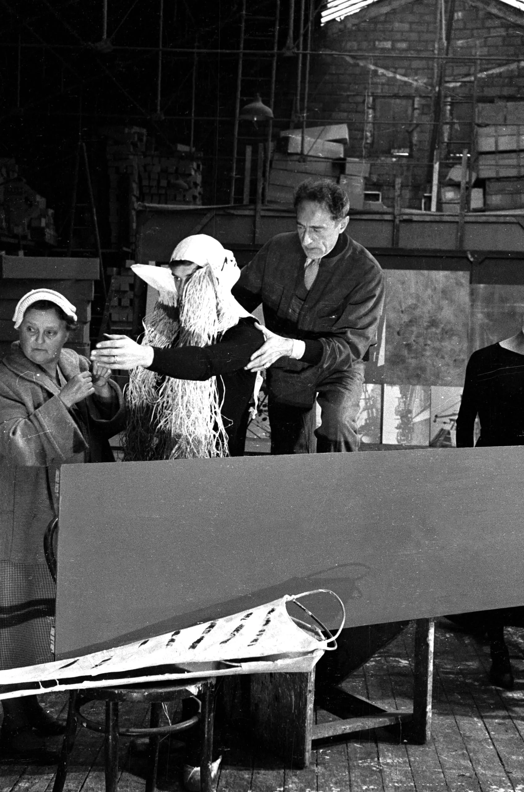 Black and white photograph of two people in a warehouse handling a handmade figure with a fabric hat and straw body, a flat panel in the foreground