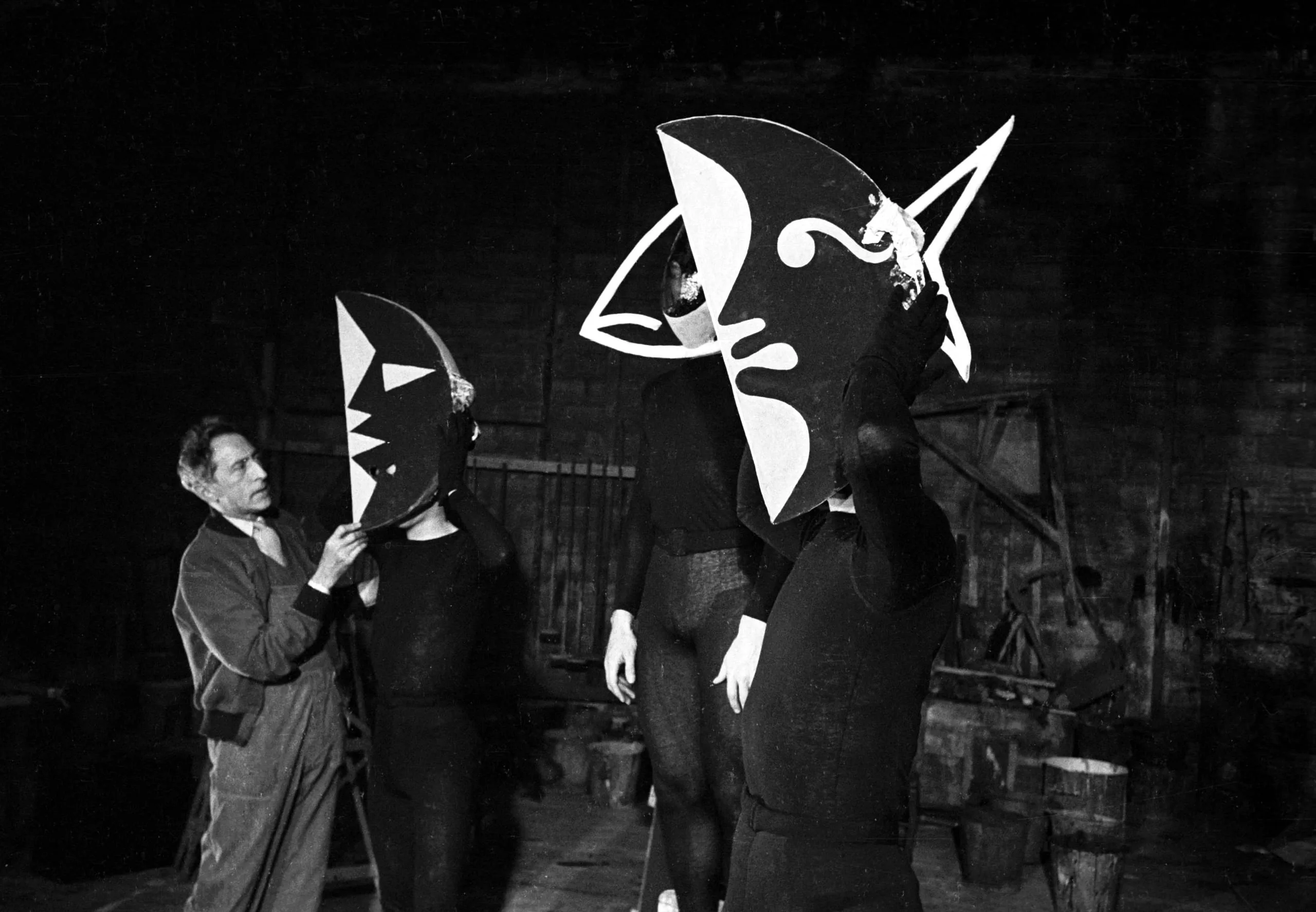 Black and white photograph of a man in work clothes fitting large abstract mask-shaped cutouts onto two figures dressed in dark bodysuits, in a dimly lit industrial interior