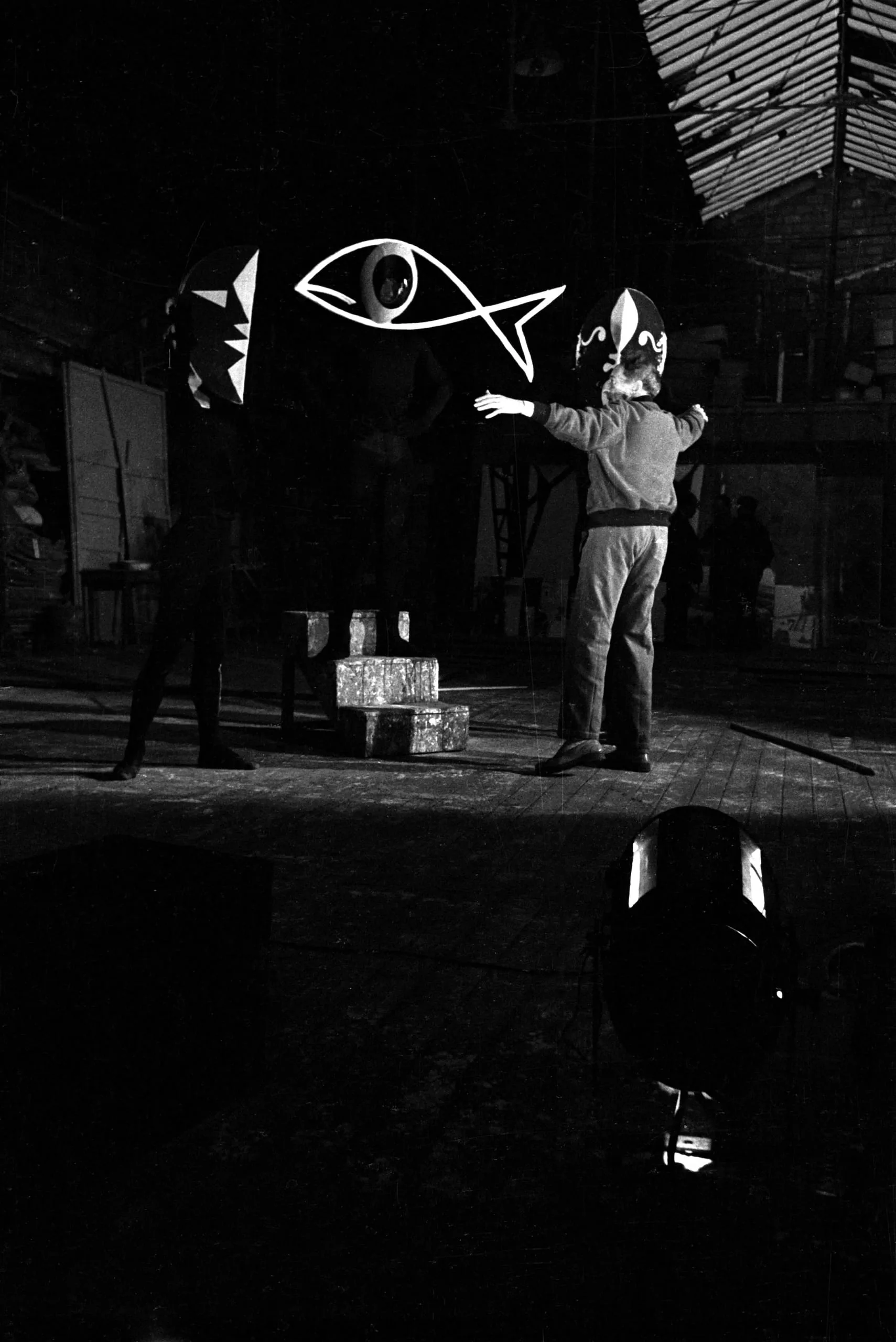 Black and white photograph of two masked figures on a darkened stage, with a glowing outlined eye-and-fish symbol between them