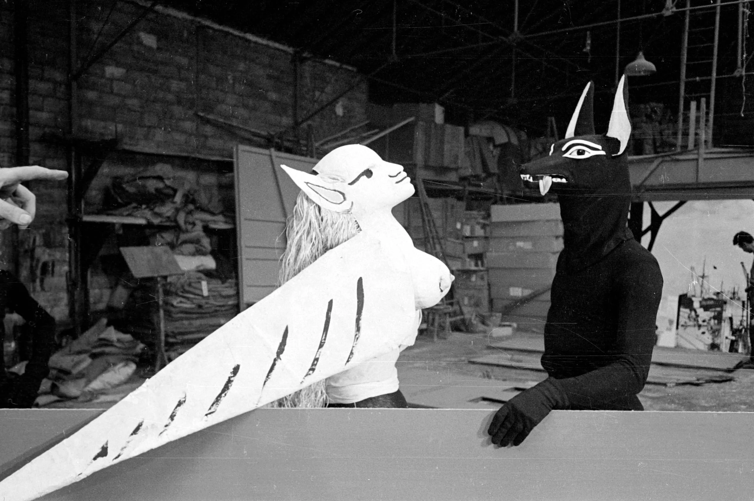 Black and white photograph of two figures in large animal-head masks — one white with blonde hair and a wing-like form, one black jackal-headed — facing each other across a white surface in a warehouse