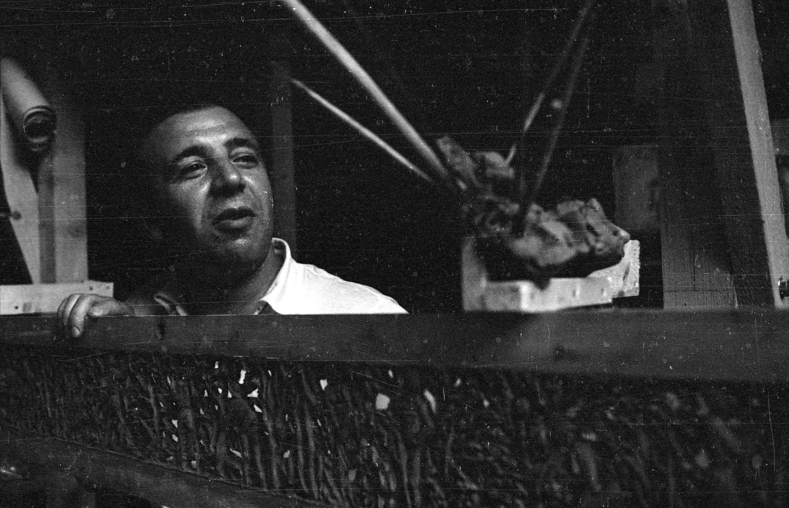 Black and white photograph of a man in a white shirt, chest up, looking upward with lips parted, leaning over an ornately textured railing with sculptural materials visible behind him
