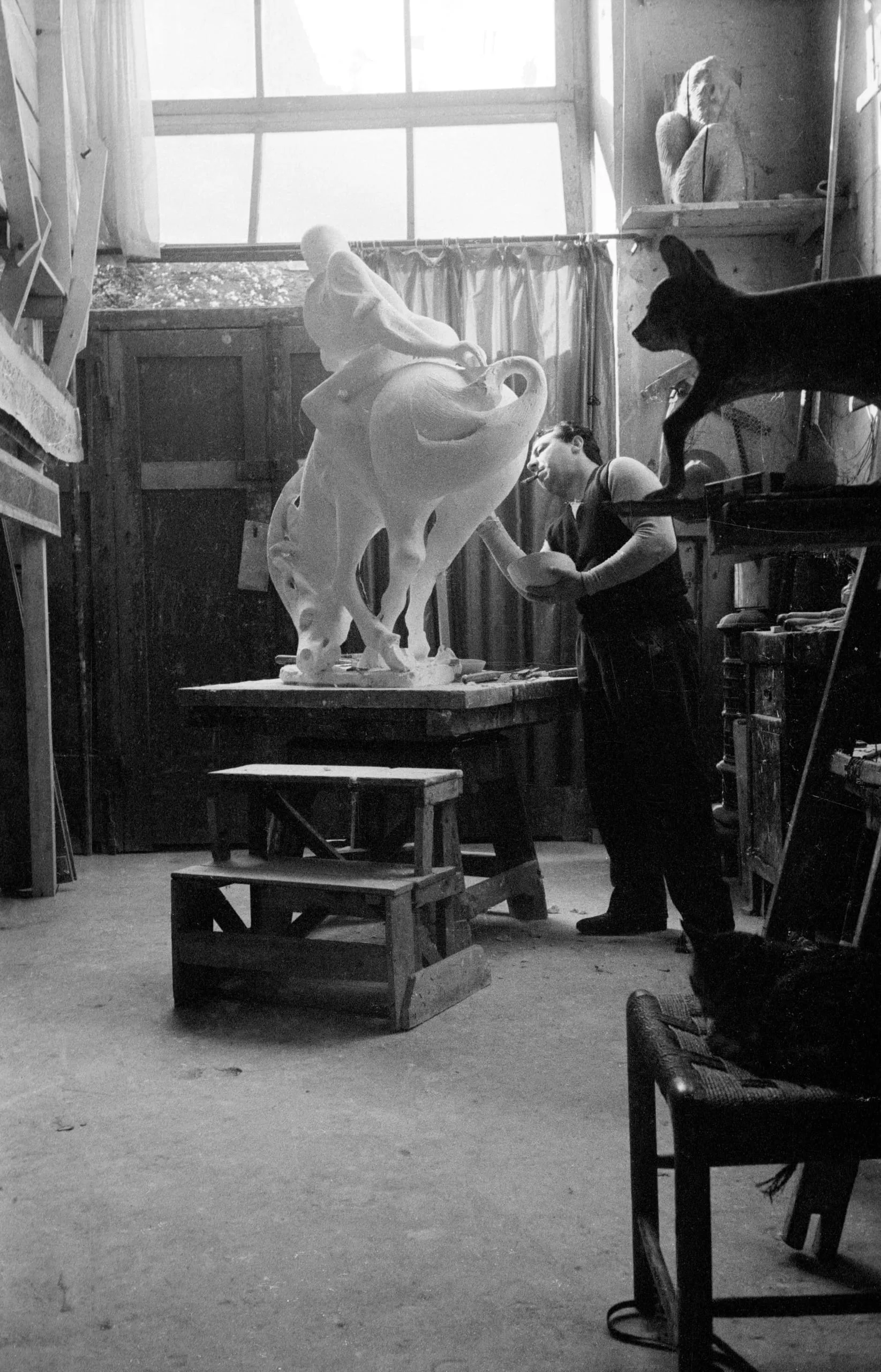 Black and white photograph of a sculptor working on a large white plaster figure of a rearing animal with a human form, set on a wooden platform in a studio