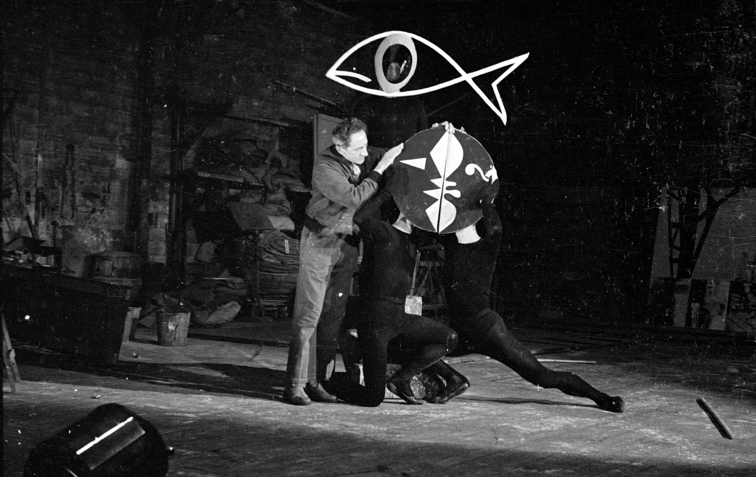 Black and white photograph of two performers on a dark stage holding a large circular painted prop, with a white line-drawn fish-eye symbol superimposed over the upper image