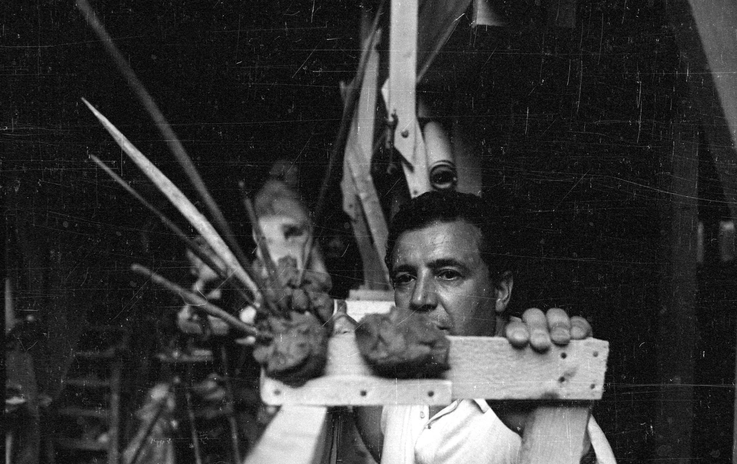 Black and white photograph of a man in a white shirt gripping a wooden bar, a spiky sculptural form in clay or plaster resting in front of his face, studio in background