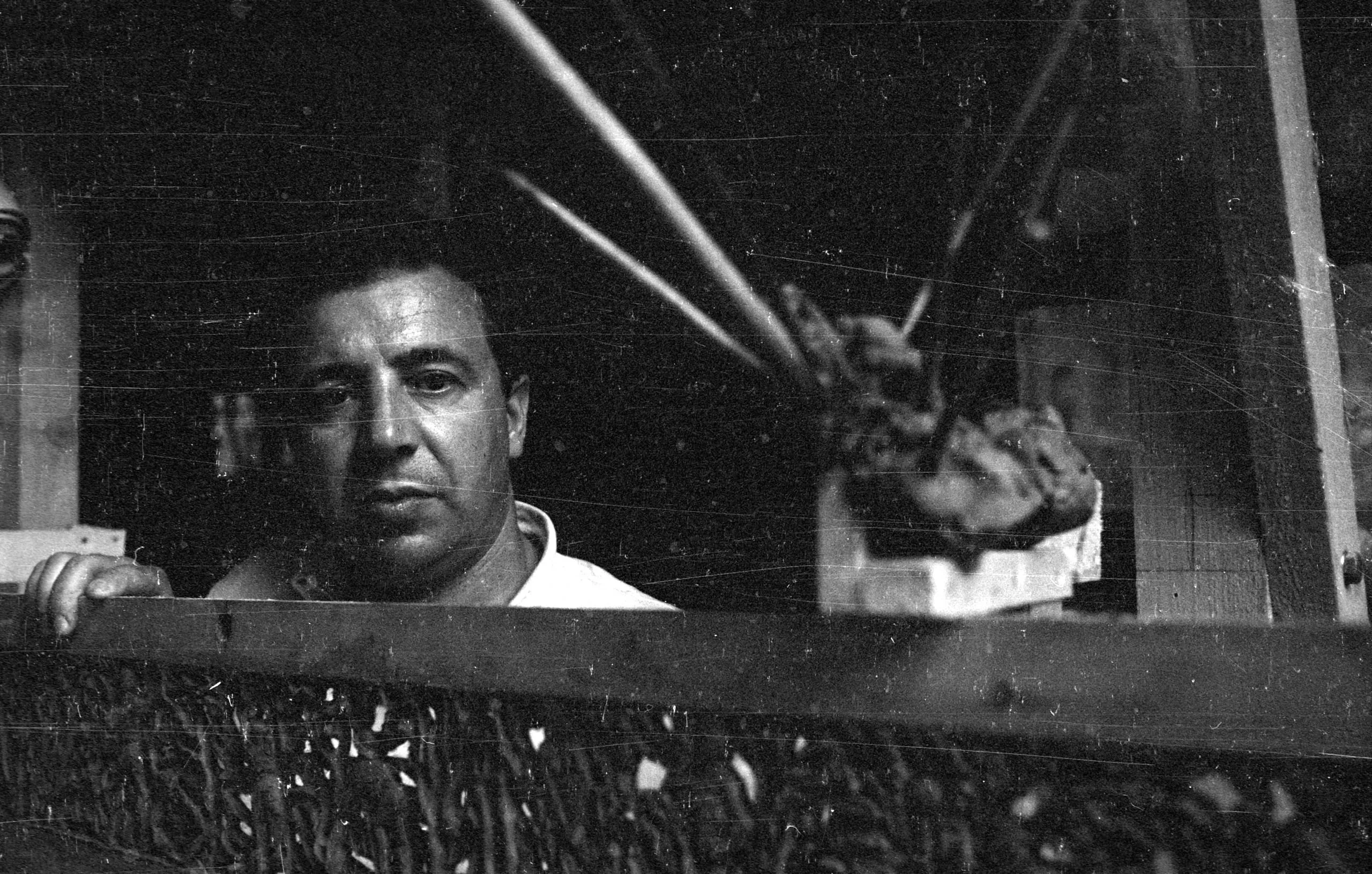 Black and white photograph of a white man seen through scratched glass, chest up behind a counter, looking directly at the camera