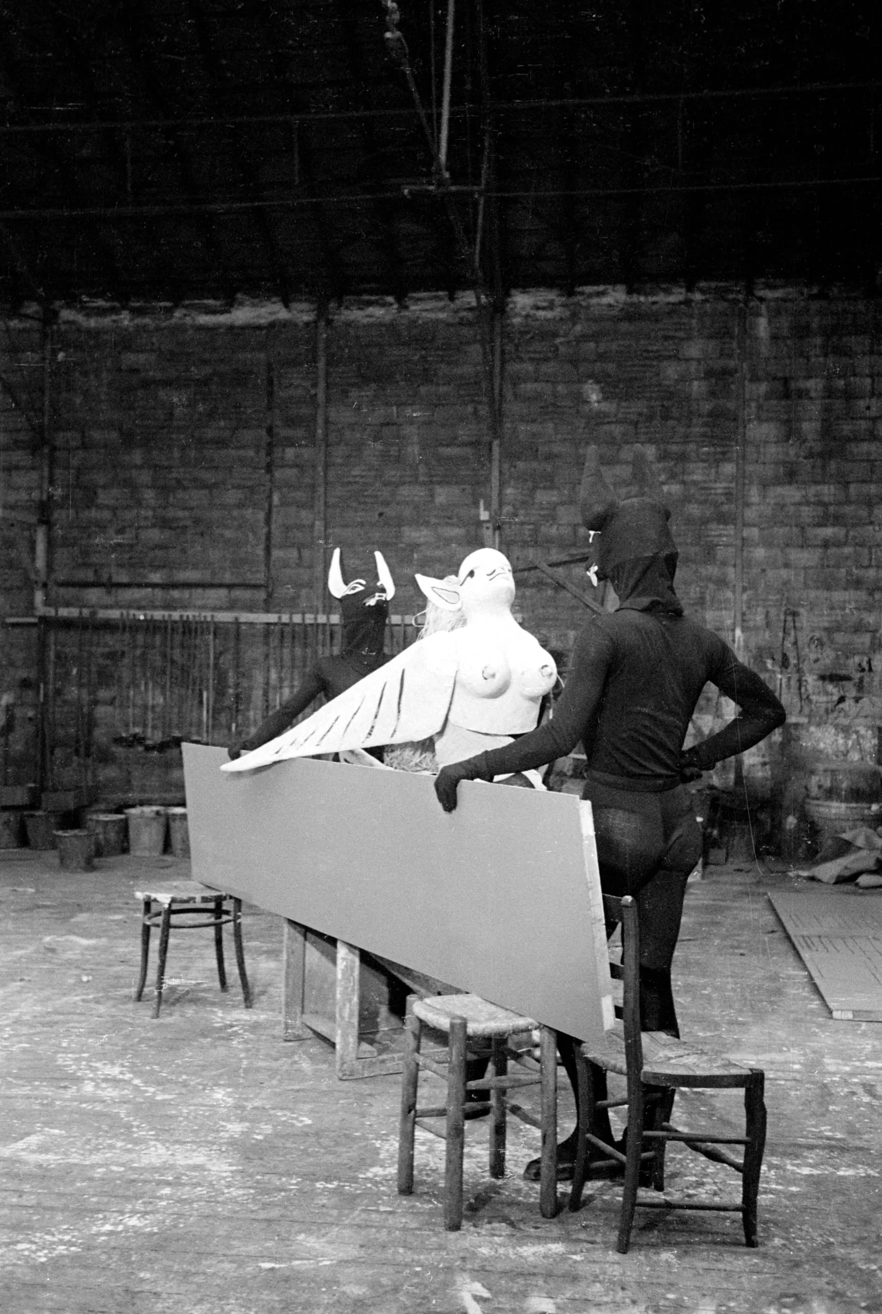 Black and white photograph of a figure in a hooded all-dark outfit standing in a large brick-walled studio, leaning over a reclining white sculptural form with wing-like shapes