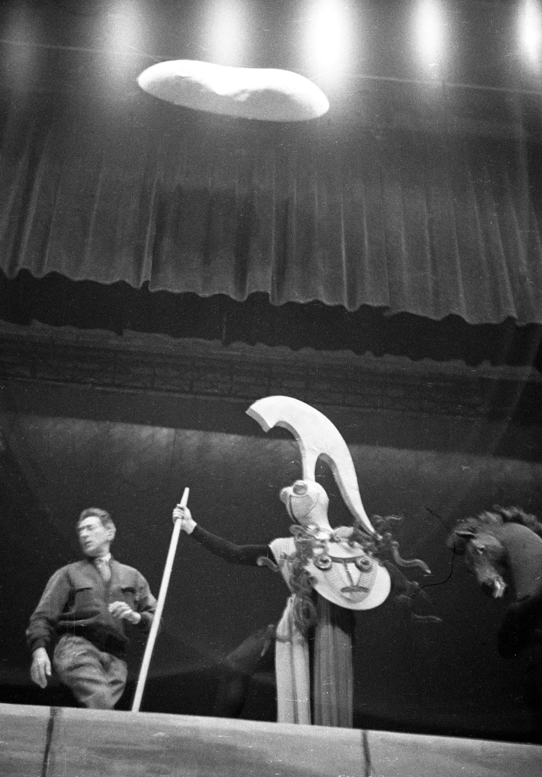 Black and white photograph of a theatrical stage scene with a performer in an oversized sculptural mask costume, a man holding a pole, and a horse head visible at the right edge