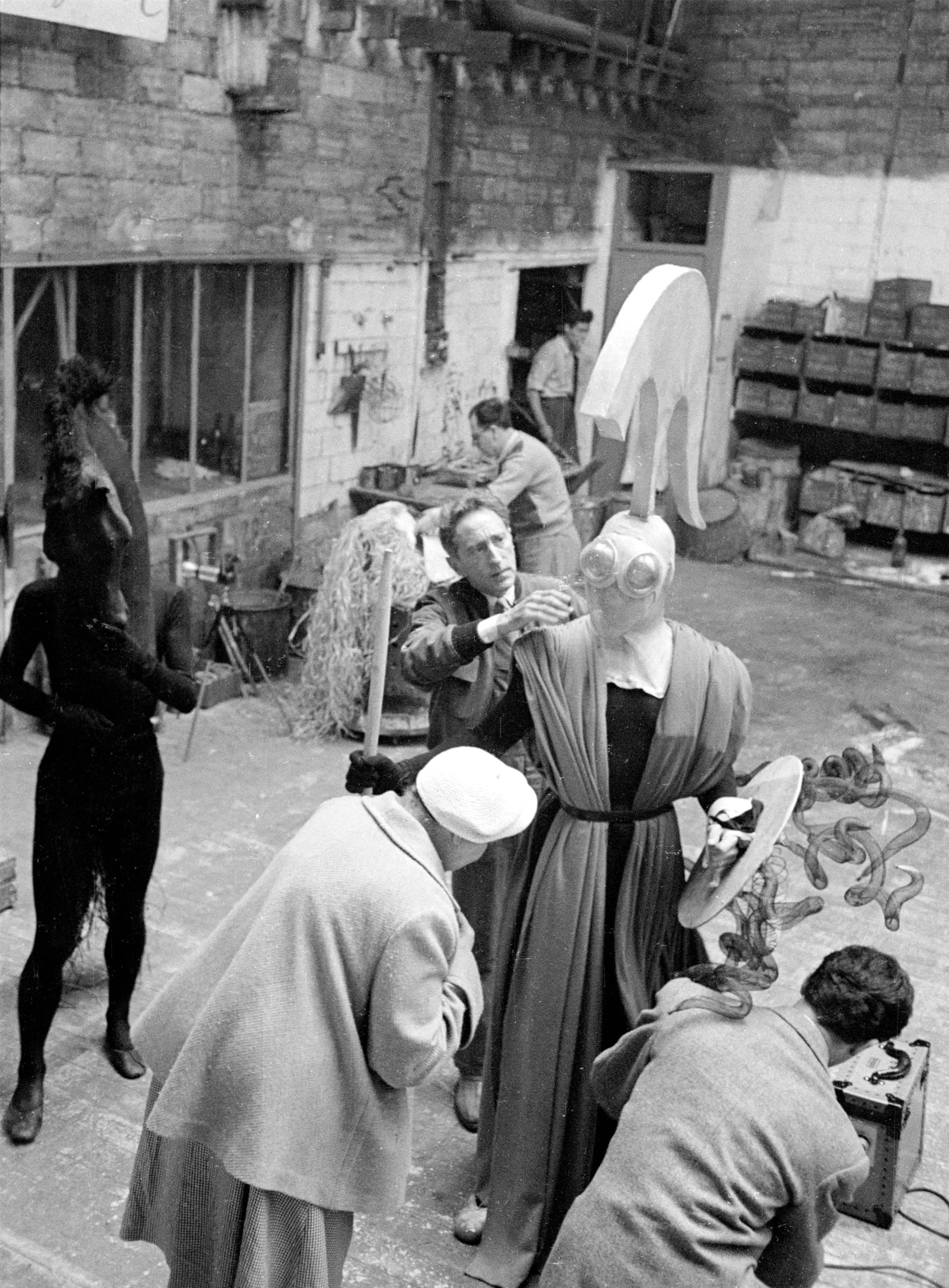 Black and white photograph of several people in a large workshop studio, one figure wearing a draped robe, goggles, and a large white abstract sculptural form rising from the head