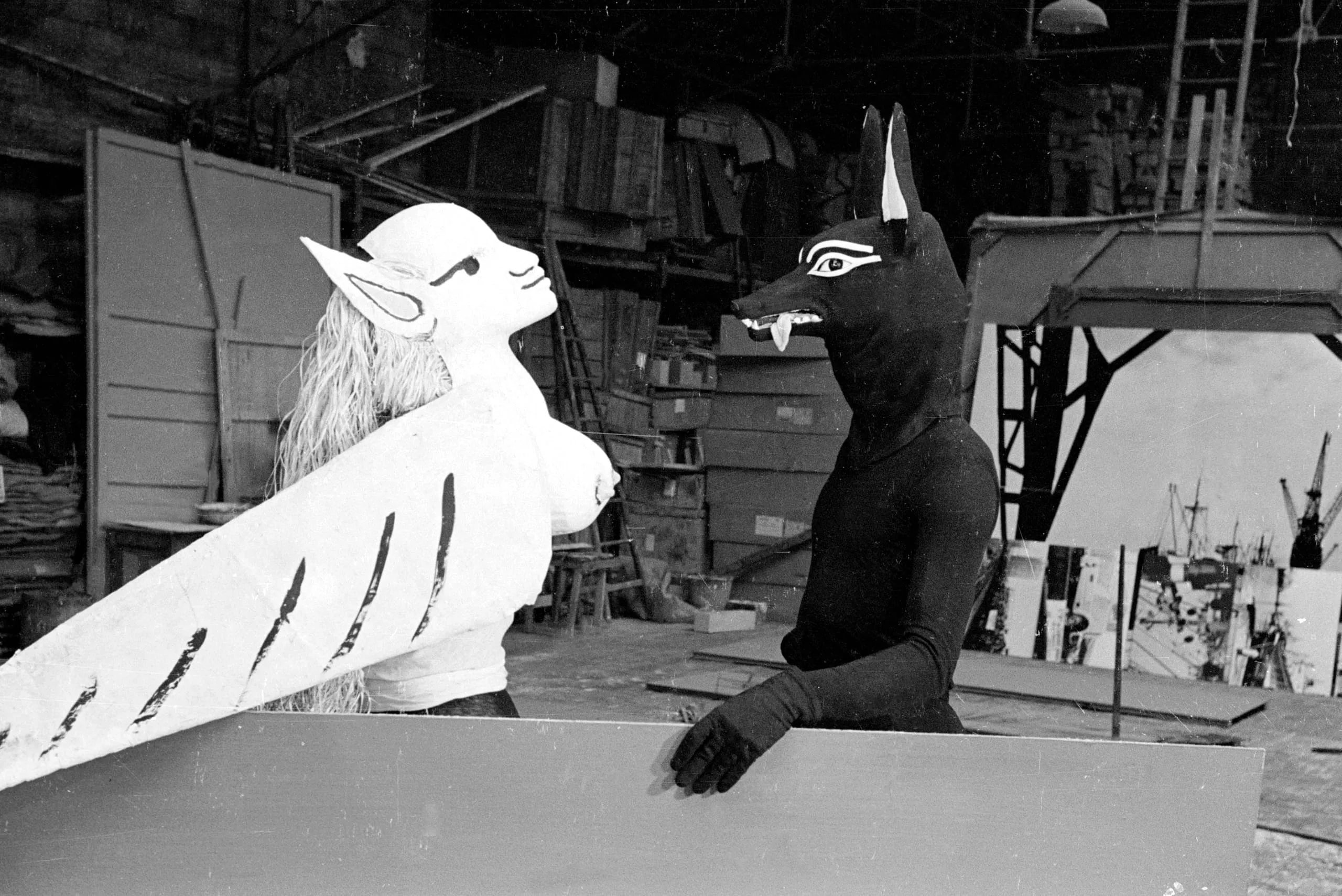 Black and white photograph of two costumed figures in a workshop, one in a white winged bird mask and one in a dark jackal-like mask, facing each other over a flat panel