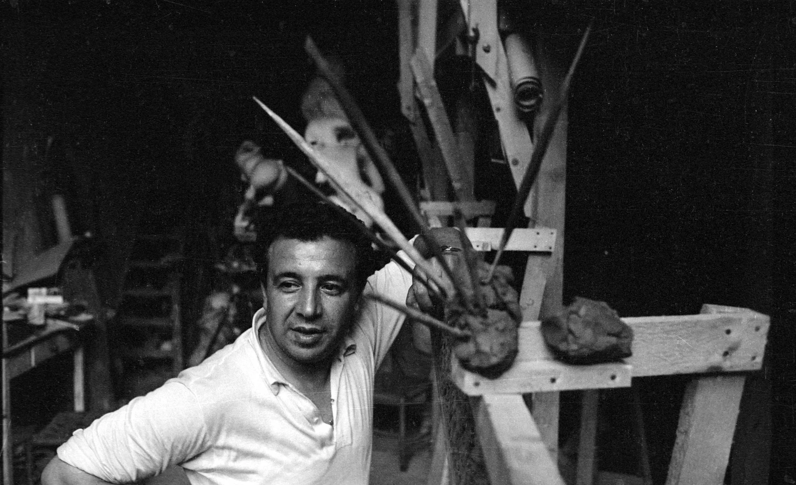 Black and white photograph of a man in a white shirt leaning against a wooden sawhorse in a studio, with wire armatures and clay forms extending upward behind him
