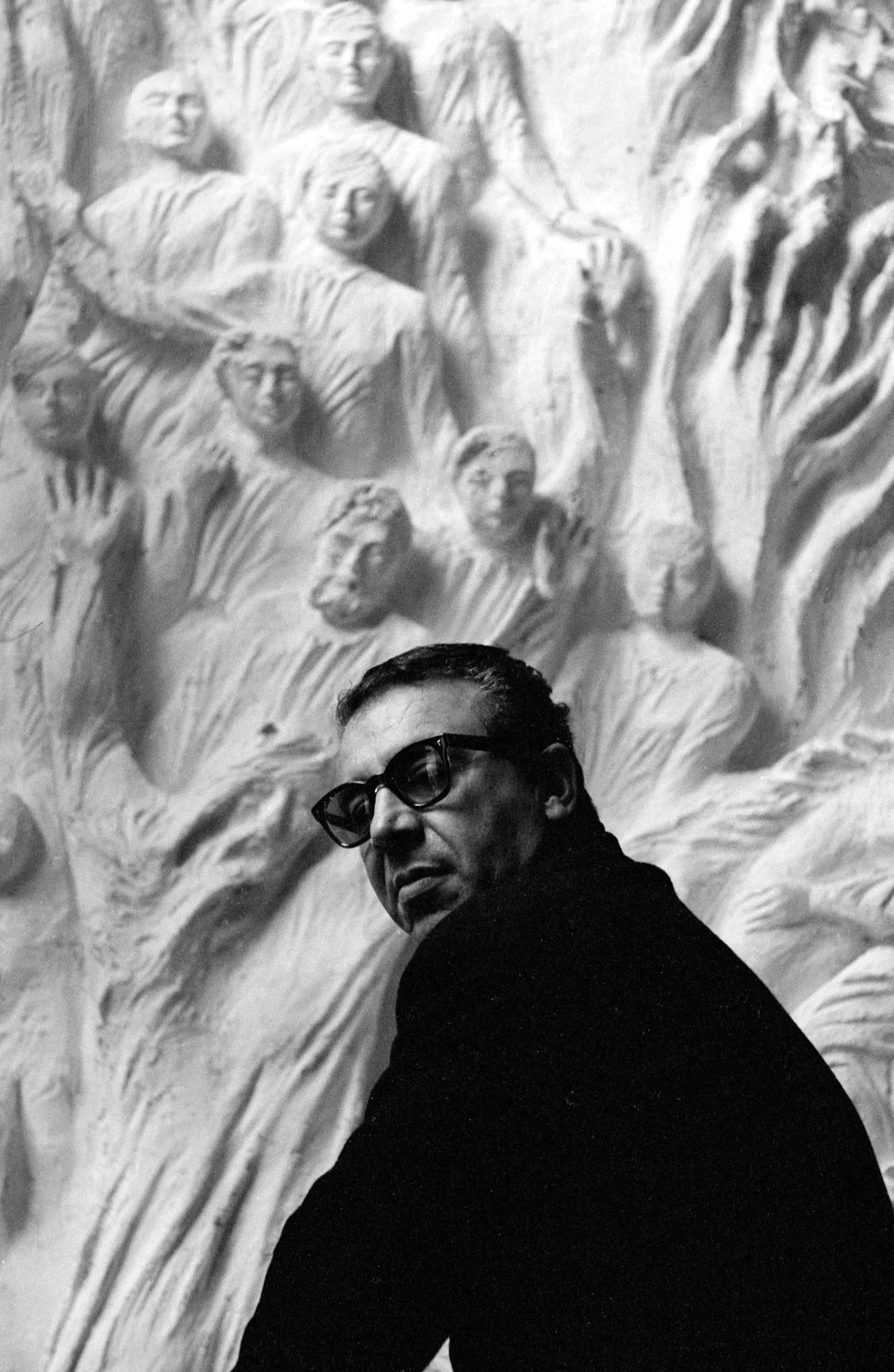 Black and white photograph of a man in dark-framed glasses and turtleneck, shown from the chest up, standing before a large white relief sculpture of crowded human figures in flowing robes