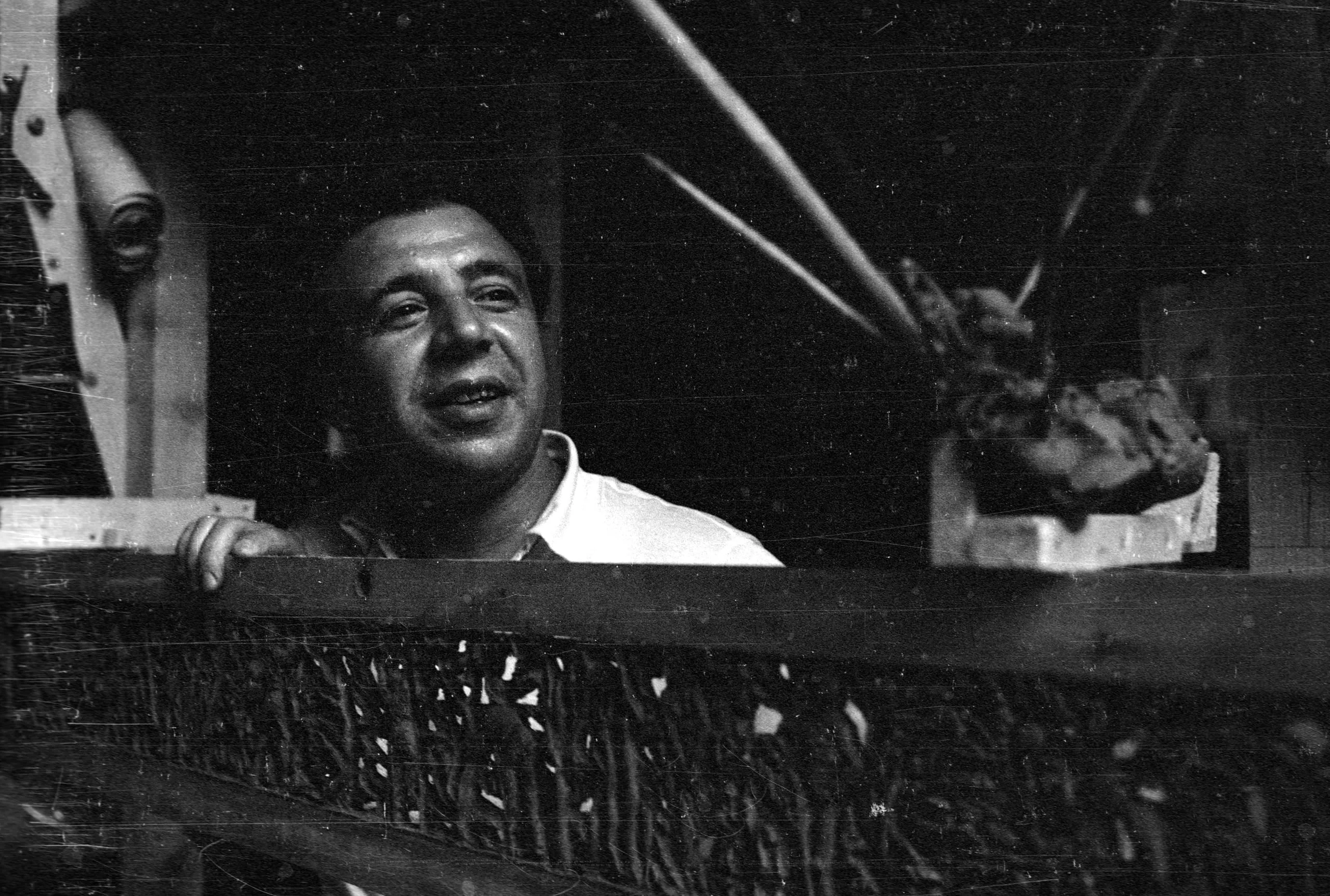 Black and white photograph of a middle-aged man leaning over an ornate pierced metal railing, looking up and to the left, with a large sculptural form visible behind him
