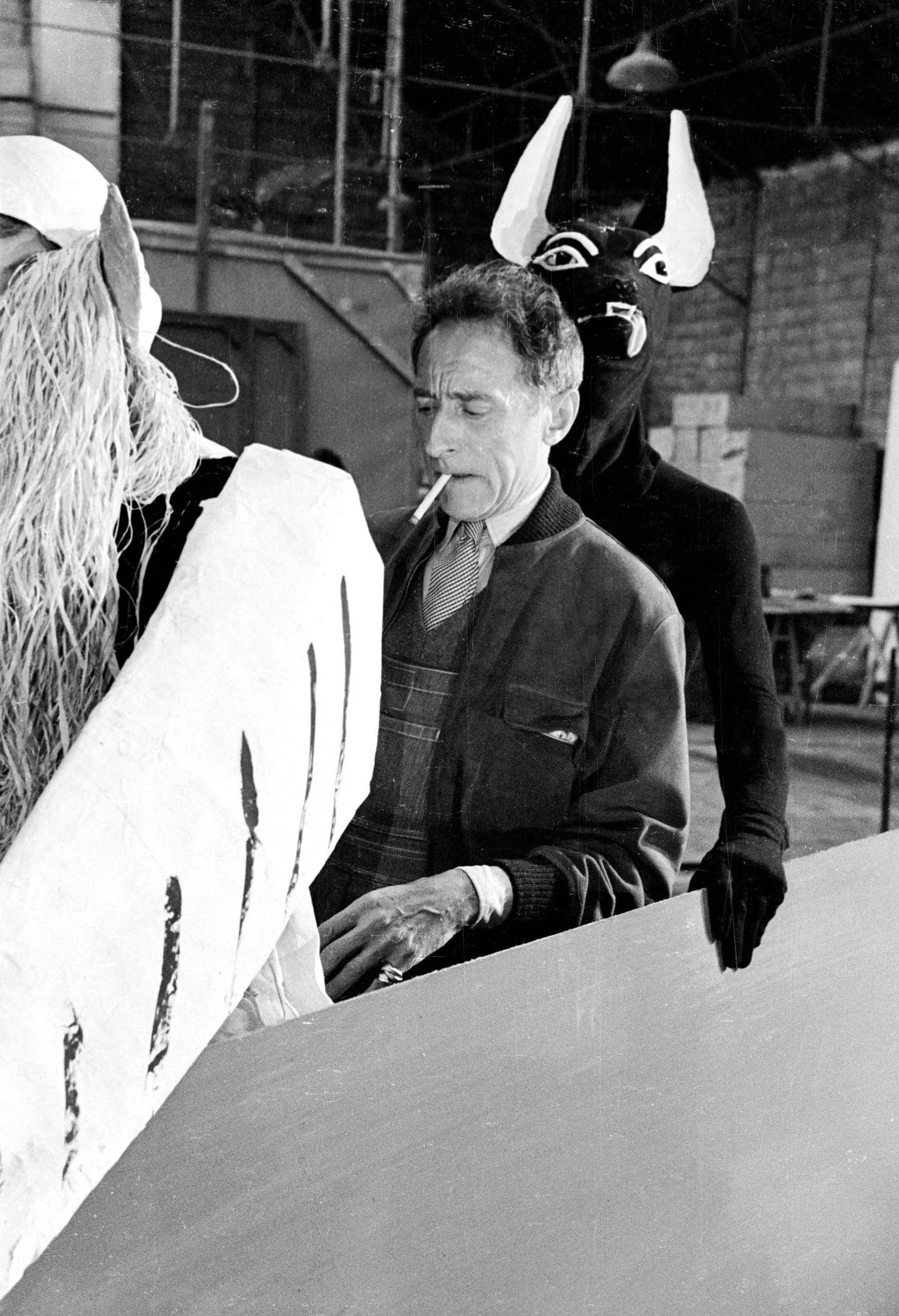 Black and white photograph of a man with a cigarette in his mouth standing in a studio, flanked by a large white painted form and a figure in a black bull mask with white horns