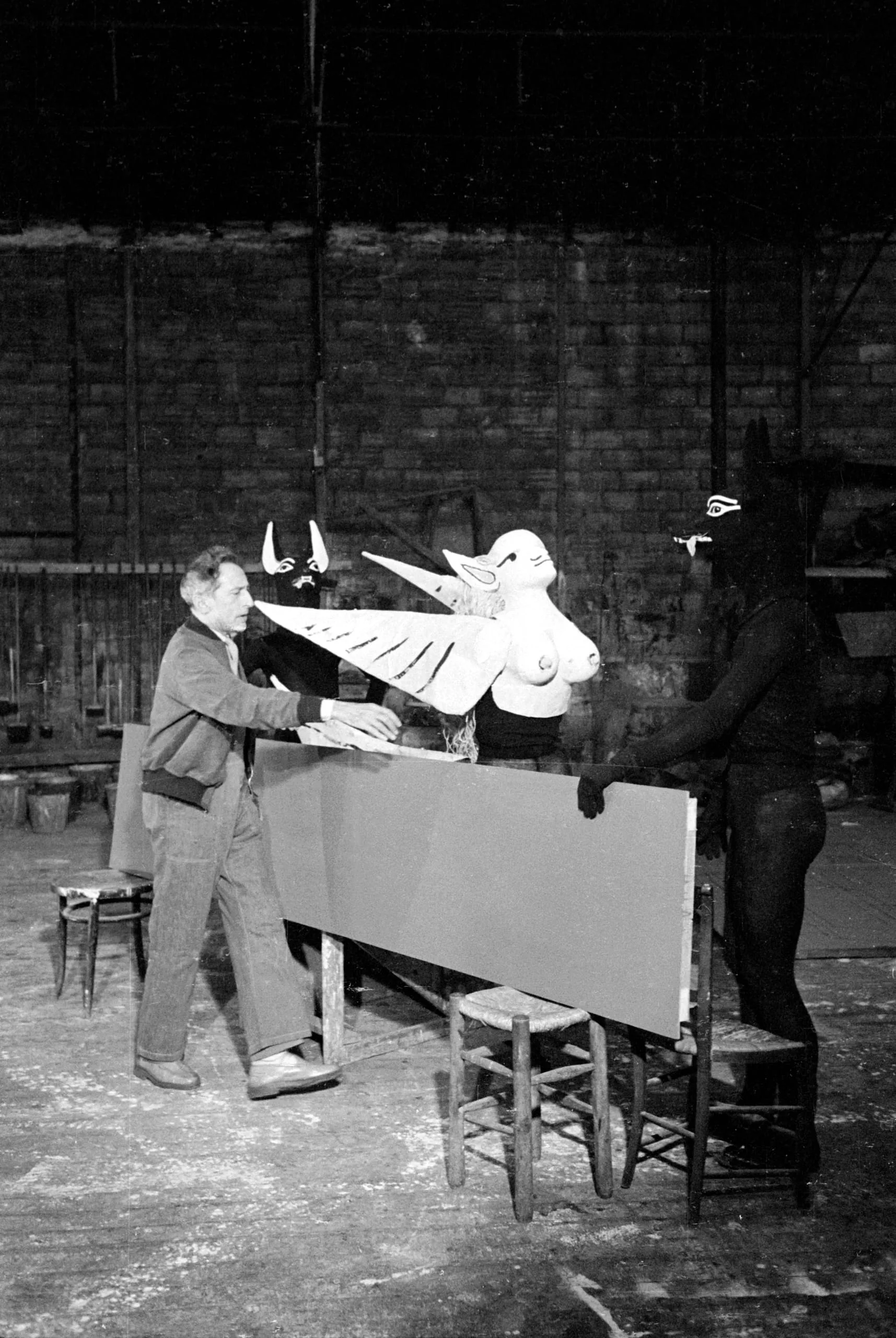 Black and white photograph of two figures in a studio workshop, one in regular clothes and one in all-black costume, handling a large flat panel with white sculptural figures resting on top