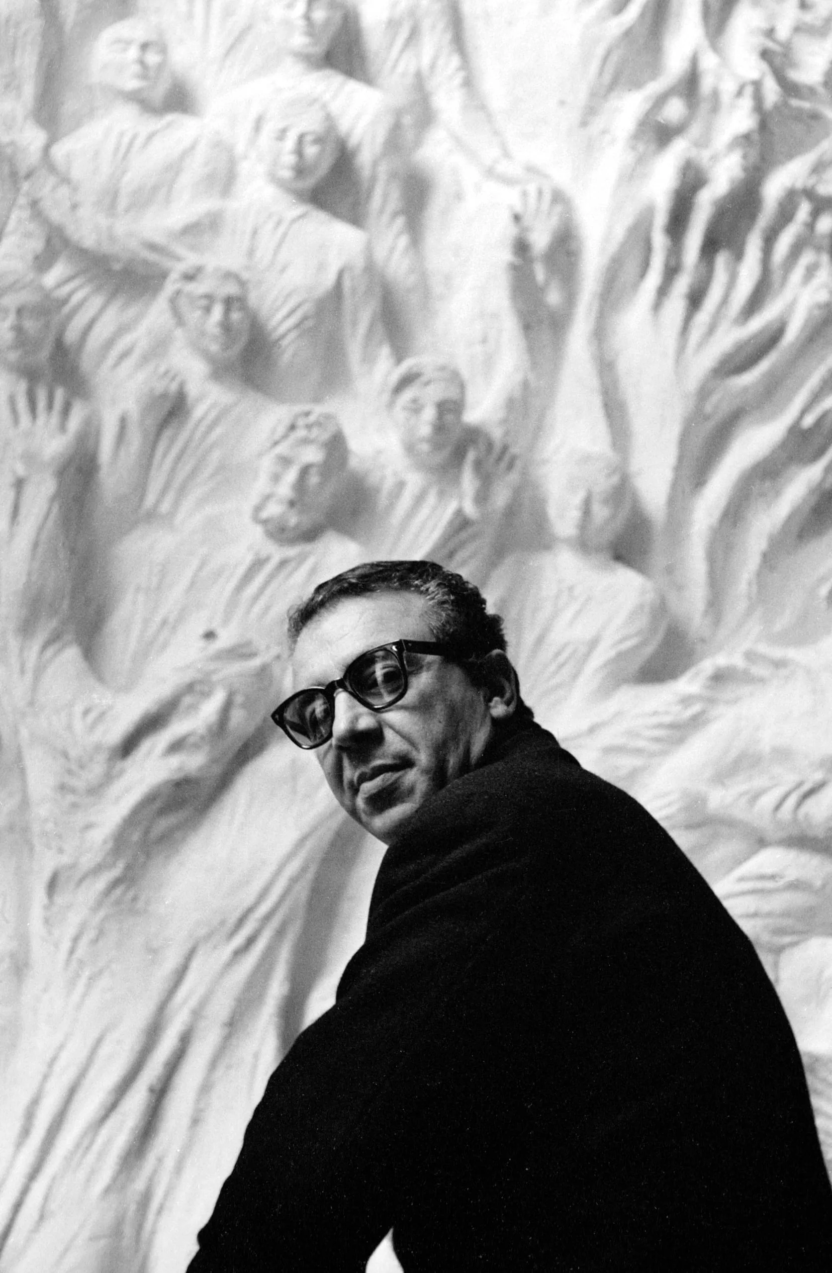 Black and white photograph, a man in a dark turtleneck and large-framed glasses looks back over his shoulder, a white figural relief sculpture filling the background