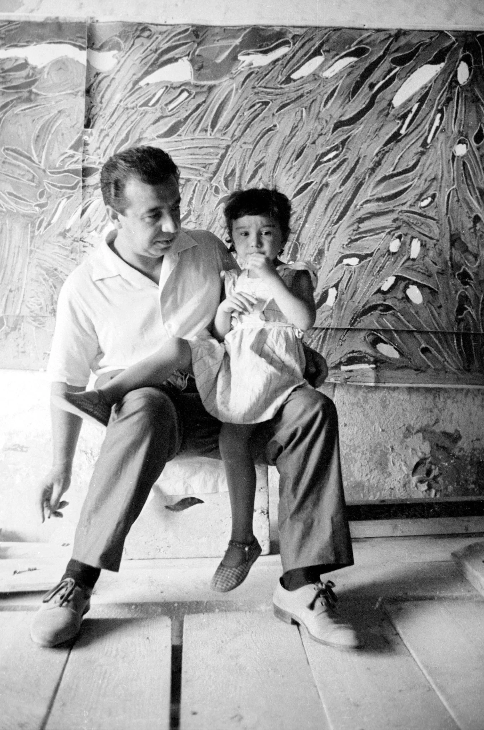 Black and white photograph of a man and young child seated on a step in front of a large abstract painting with heavily textured brushwork