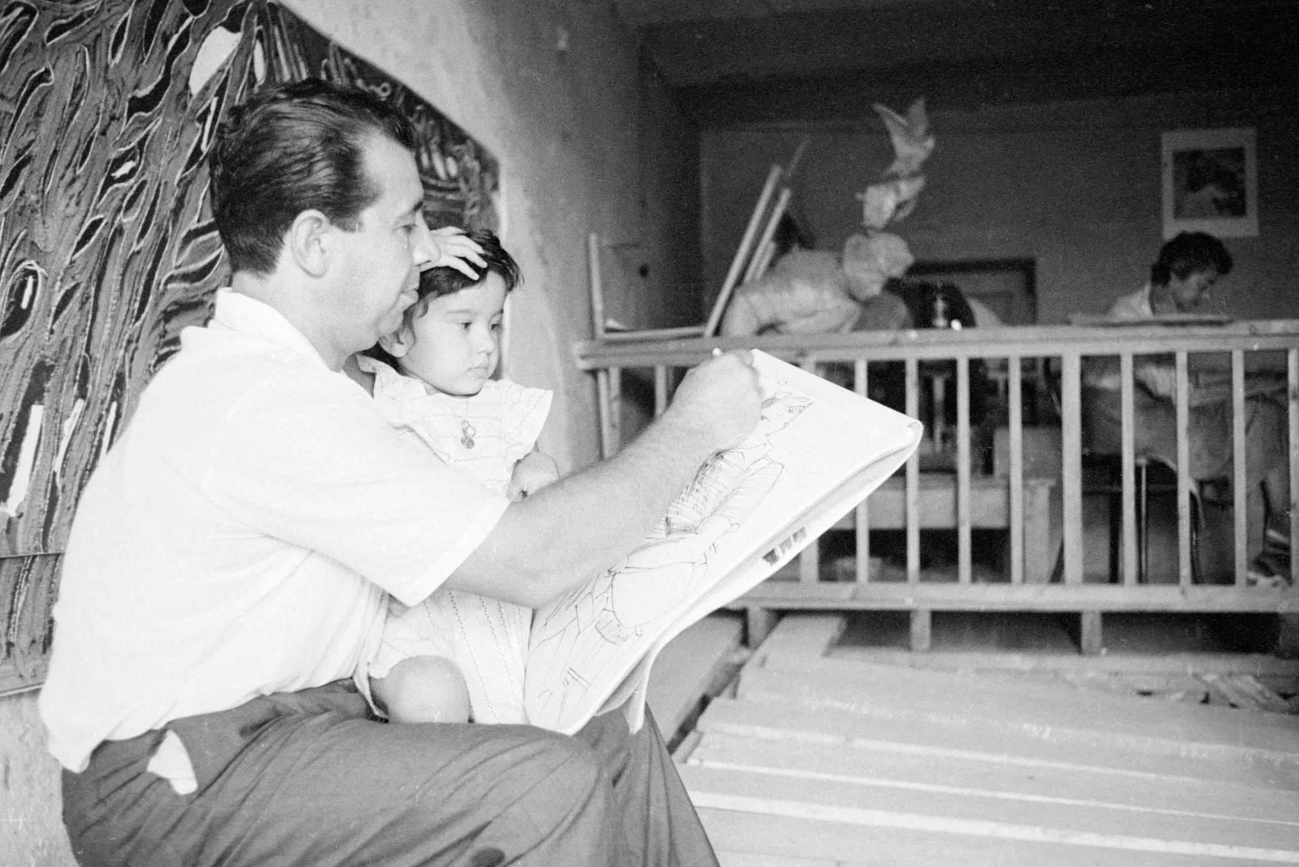 Black and white photograph of a man holding a toddler on his lap while drawing in a large open sketchbook, with a carved panel at left and a figure working in the background
