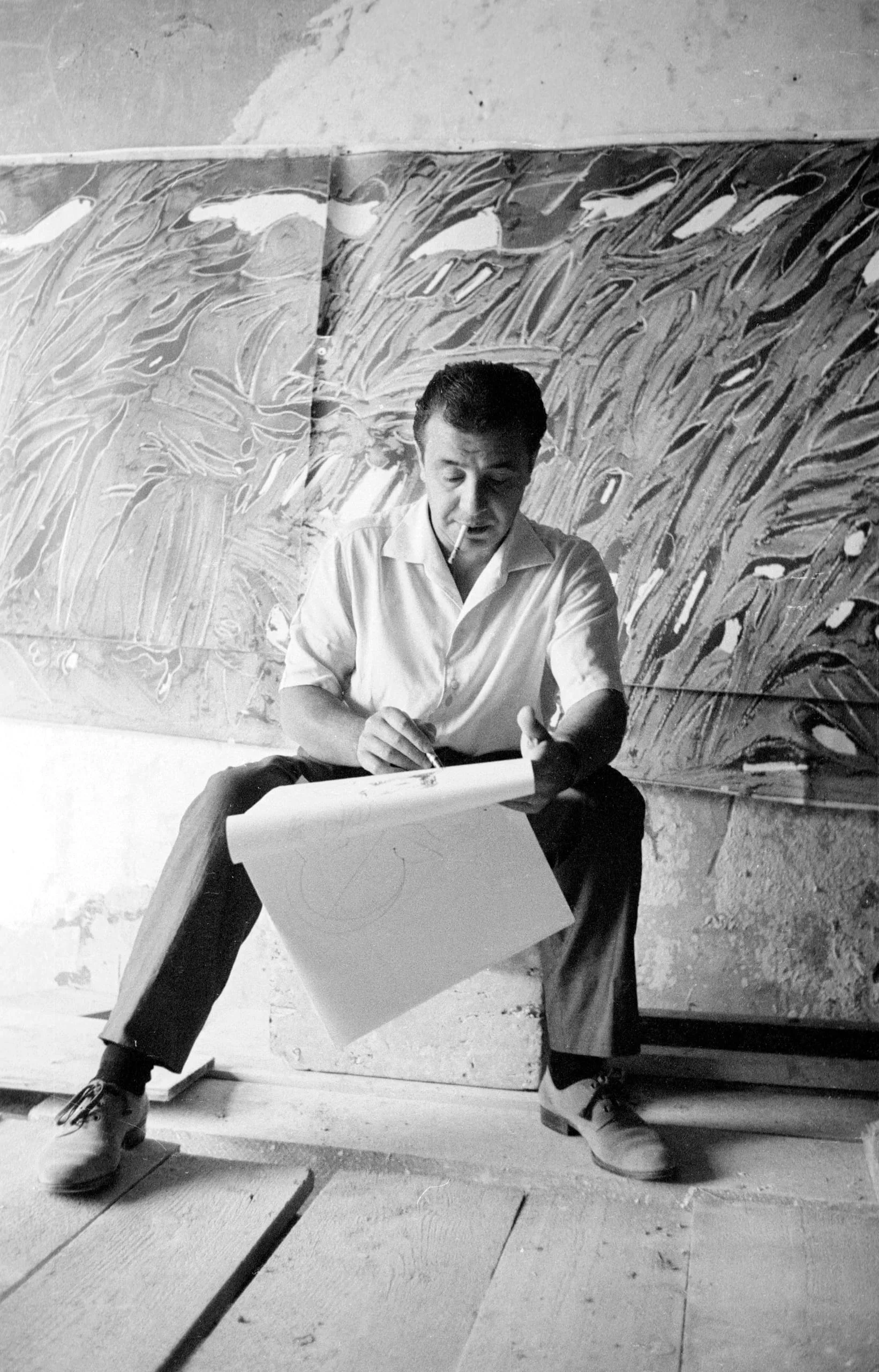 Black and white photograph of a man seated on a stone block, drawing on a large sheet of paper, with two large abstract paintings behind him