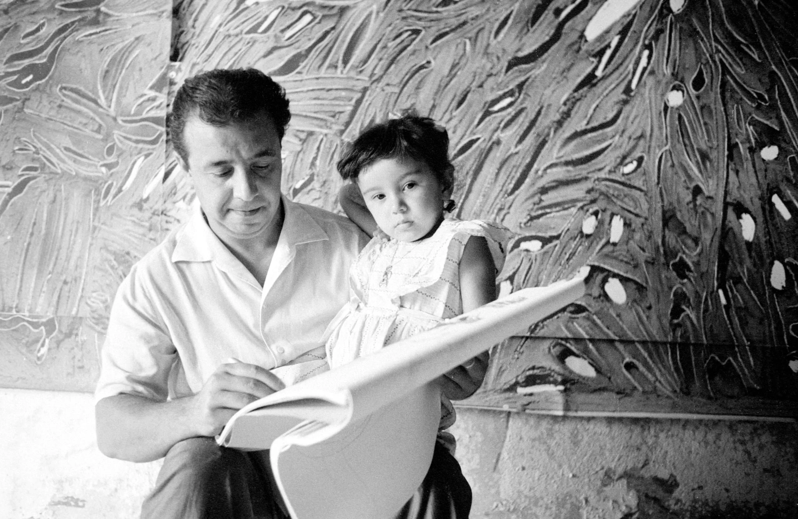 Black and white photograph of a man with dark hair looking down at an open portfolio, a young child seated beside him, with a large textured wall relief behind them
