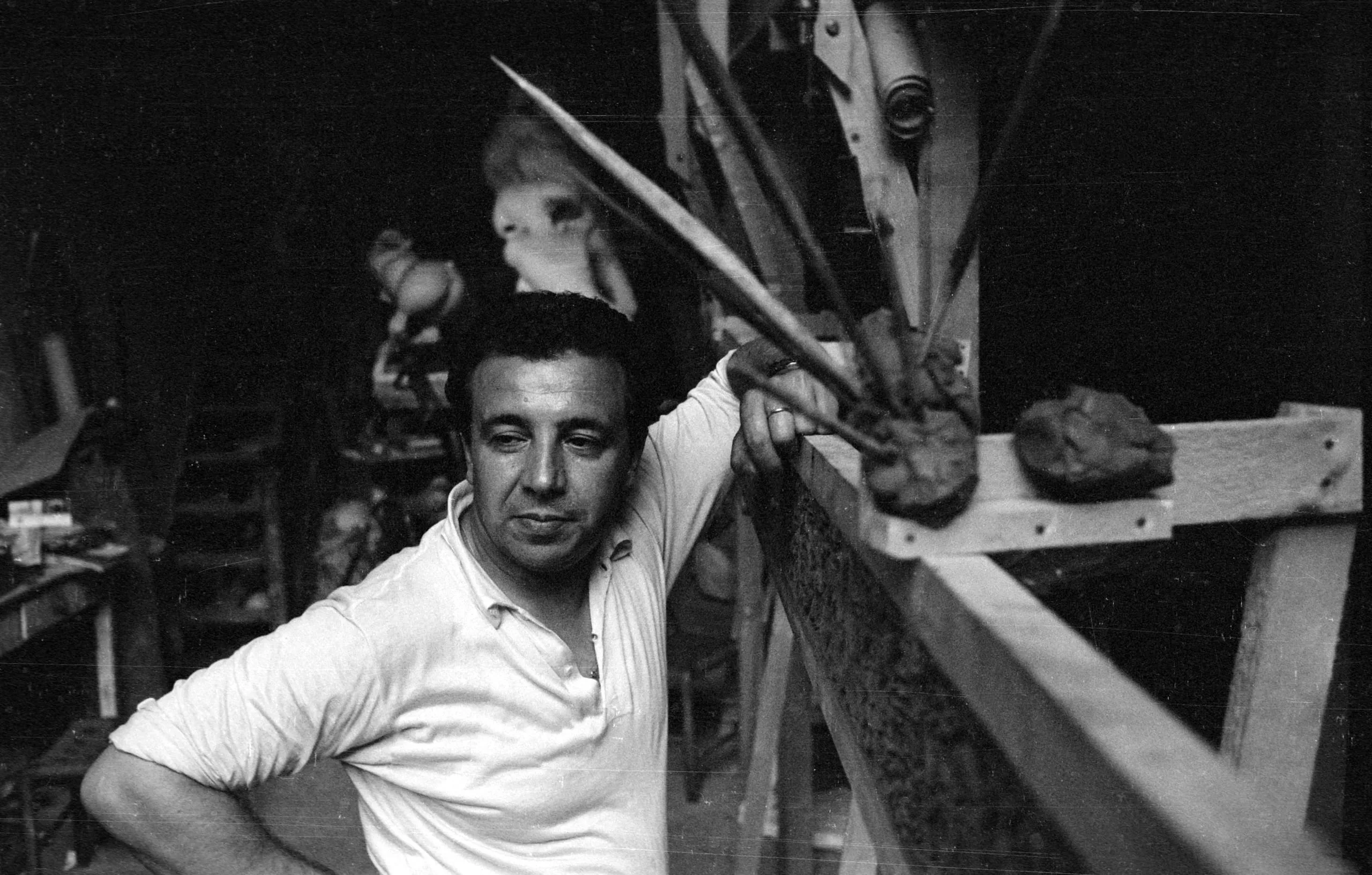 Black and white photograph of a man in a white polo shirt leaning against a wooden sculptural armature in an artist's studio