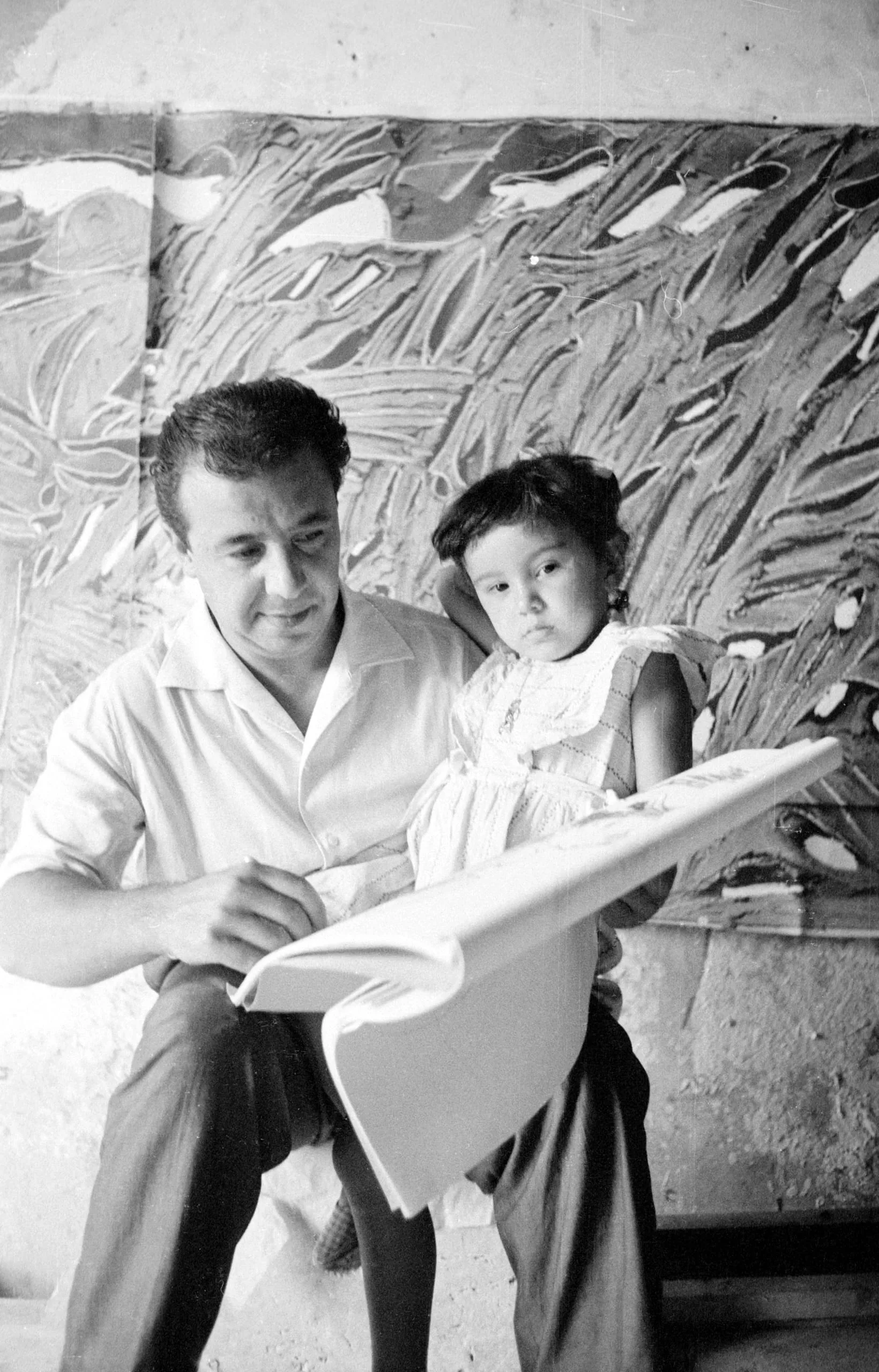 Black and white photograph of a man and young girl seated together, looking at an open book, with a large abstract impasto painting behind them