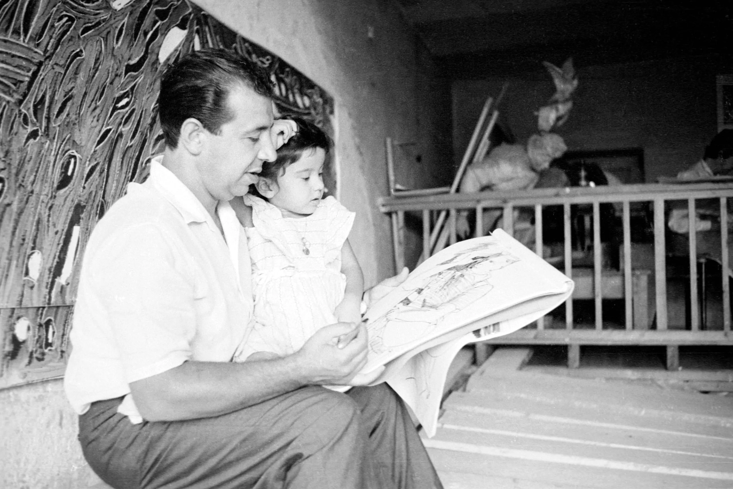 Black and white photograph of a man with a toddler in his lap, both looking down at a large open book or portfolio, seated outdoors beside a carved wooden panel
