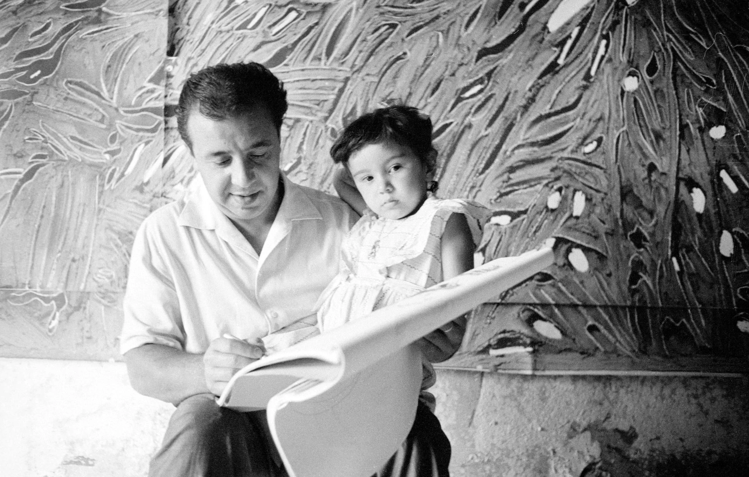 Black and white photograph of a man with brown skin drawing in a large sketchbook while a young child sits in his lap, a large textured mural behind them