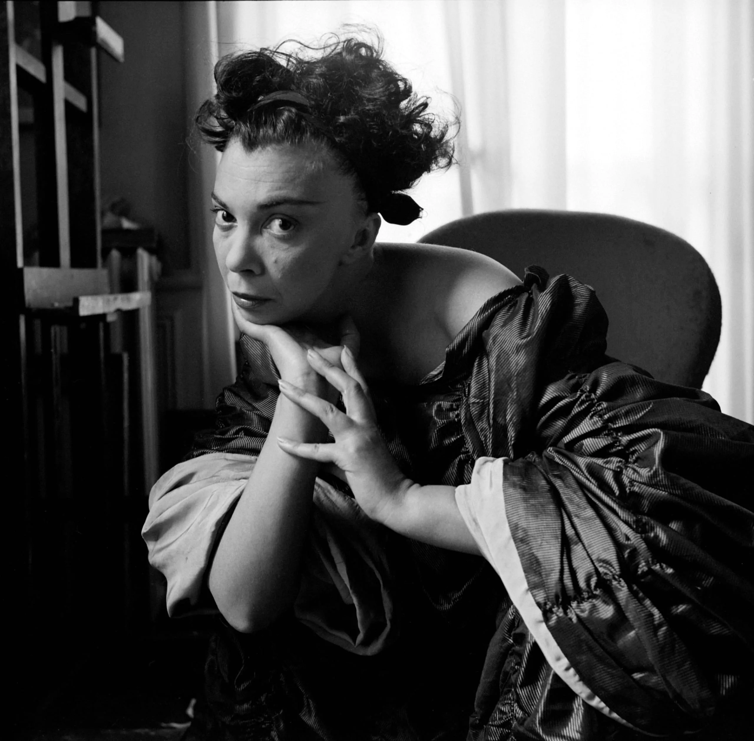 Black and white photograph, a white woman in an off-the-shoulder, shiny striped dress leans forward with clasped hands beneath her chin, looking directly at the camera