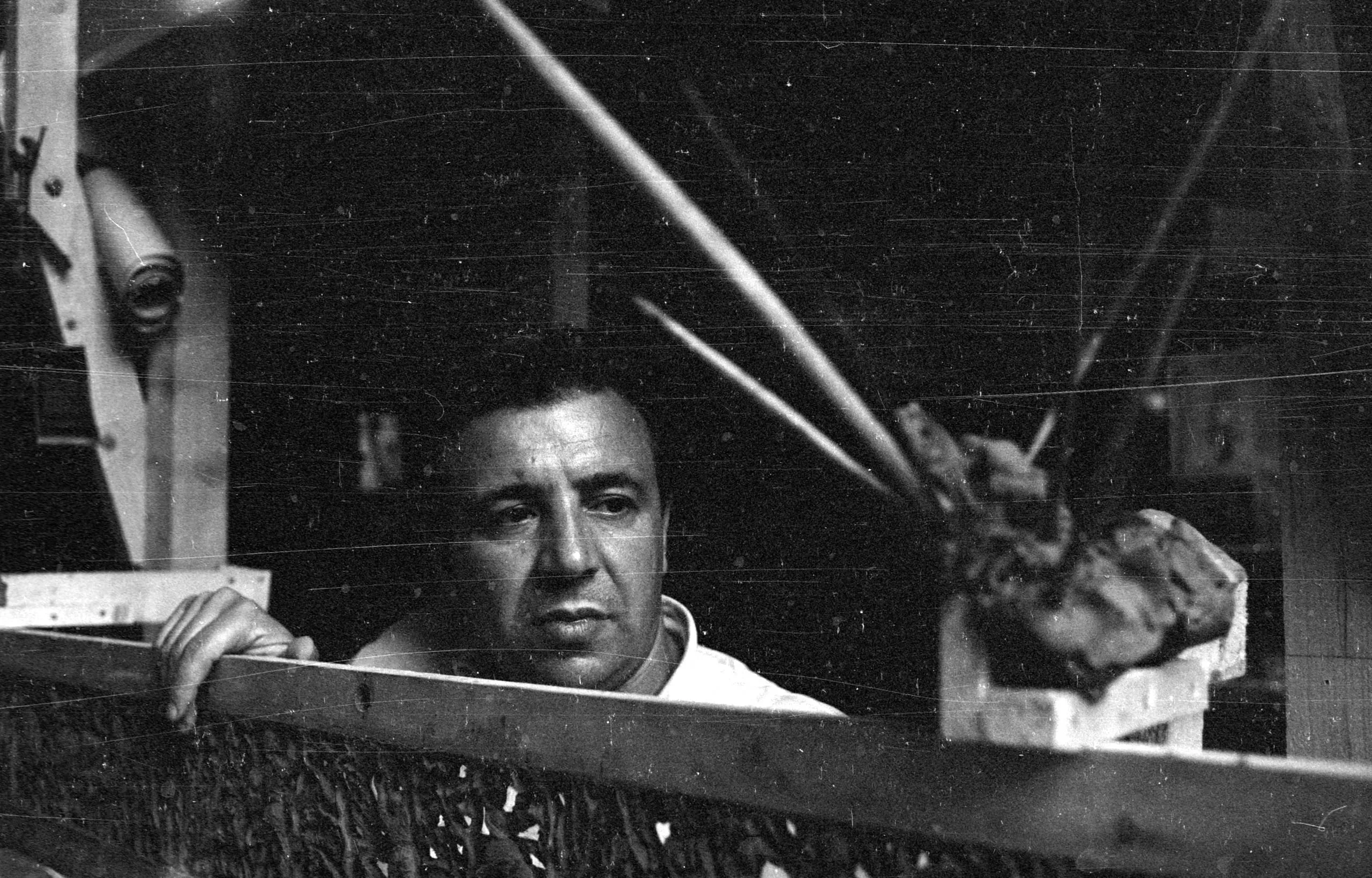 Black and white photograph of a man gripping a railing in the foreground, with a rough sculptural bust on an armature visible behind him, studio setting