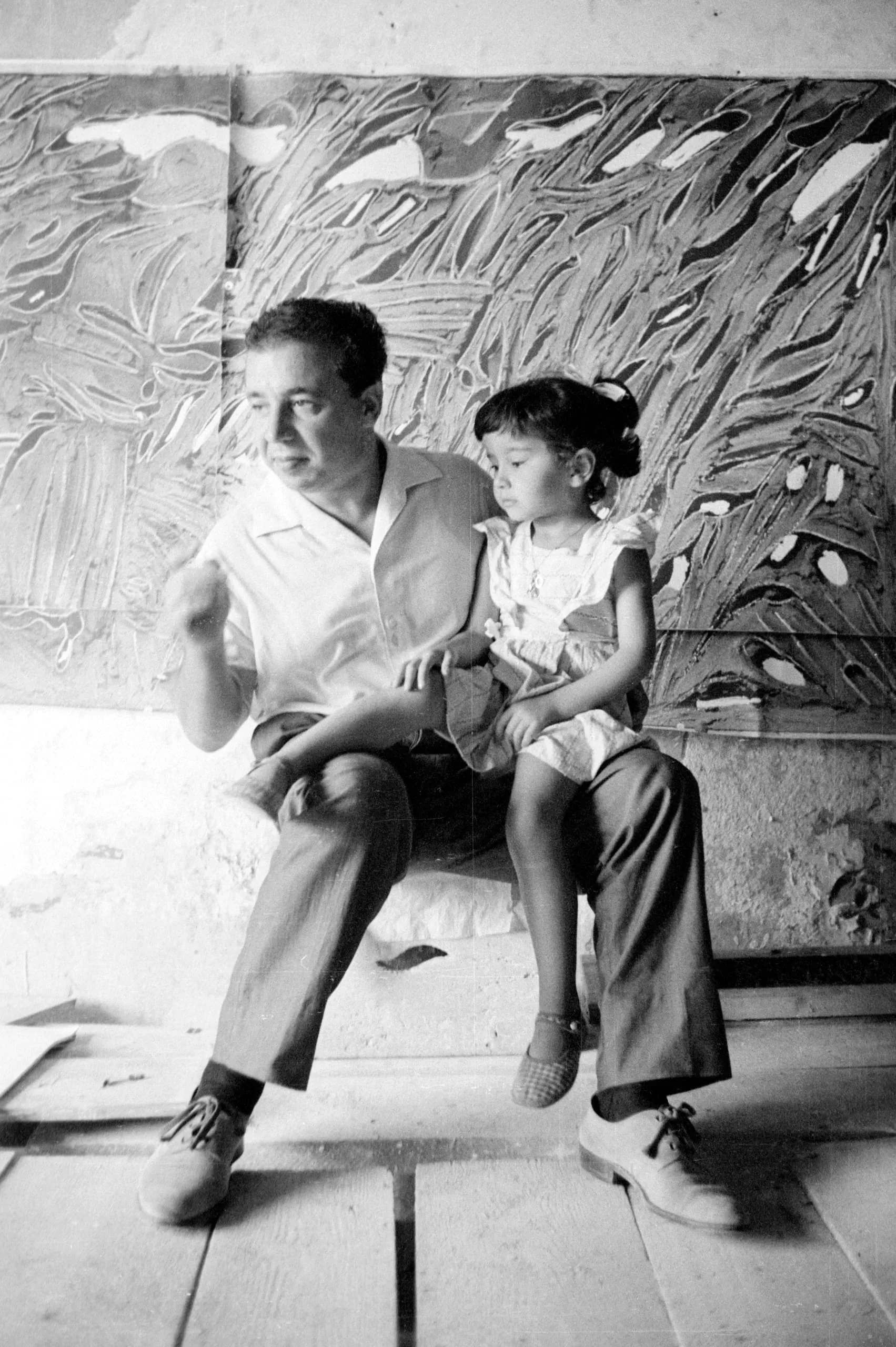 Black and white photograph of a man and a young girl seated before a large, heavily textured abstract painting with swirling brushwork