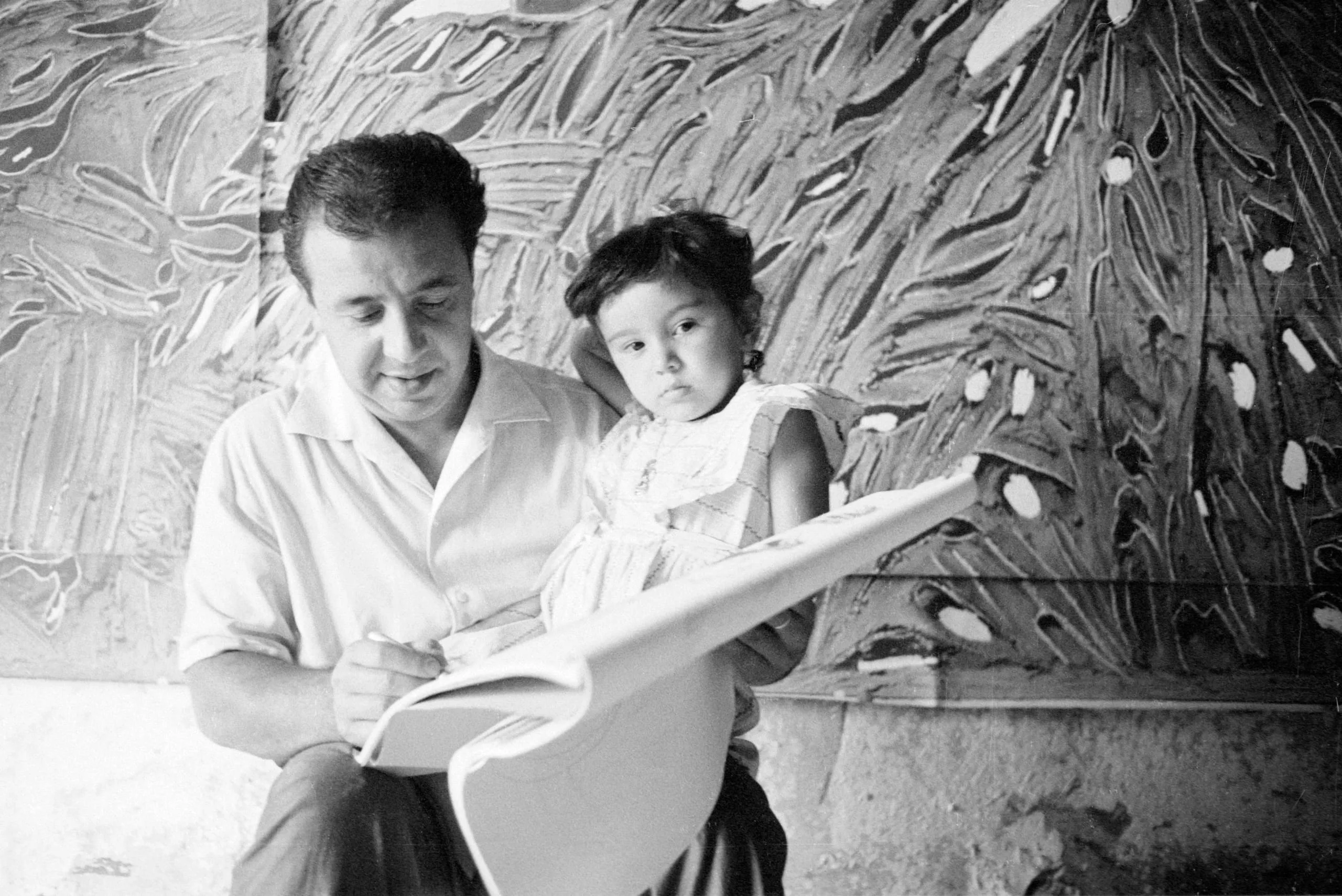Black and white photograph of a man looking down at an open sketchbook with a young child leaning against him, seated before a large gestural painting