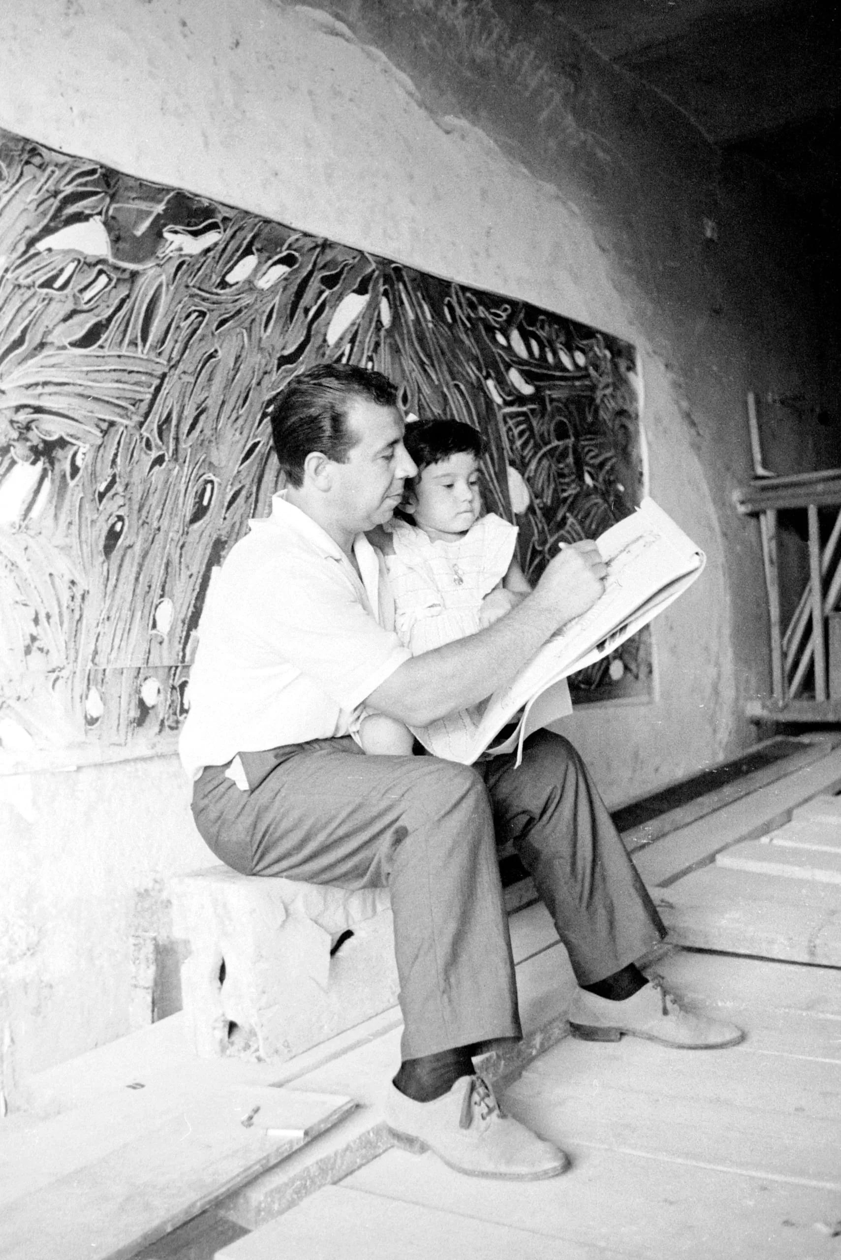 Black and white photograph of a man sketching in a pad while a young child sits beside him on stone steps, a large carved relief panel filling the wall behind them