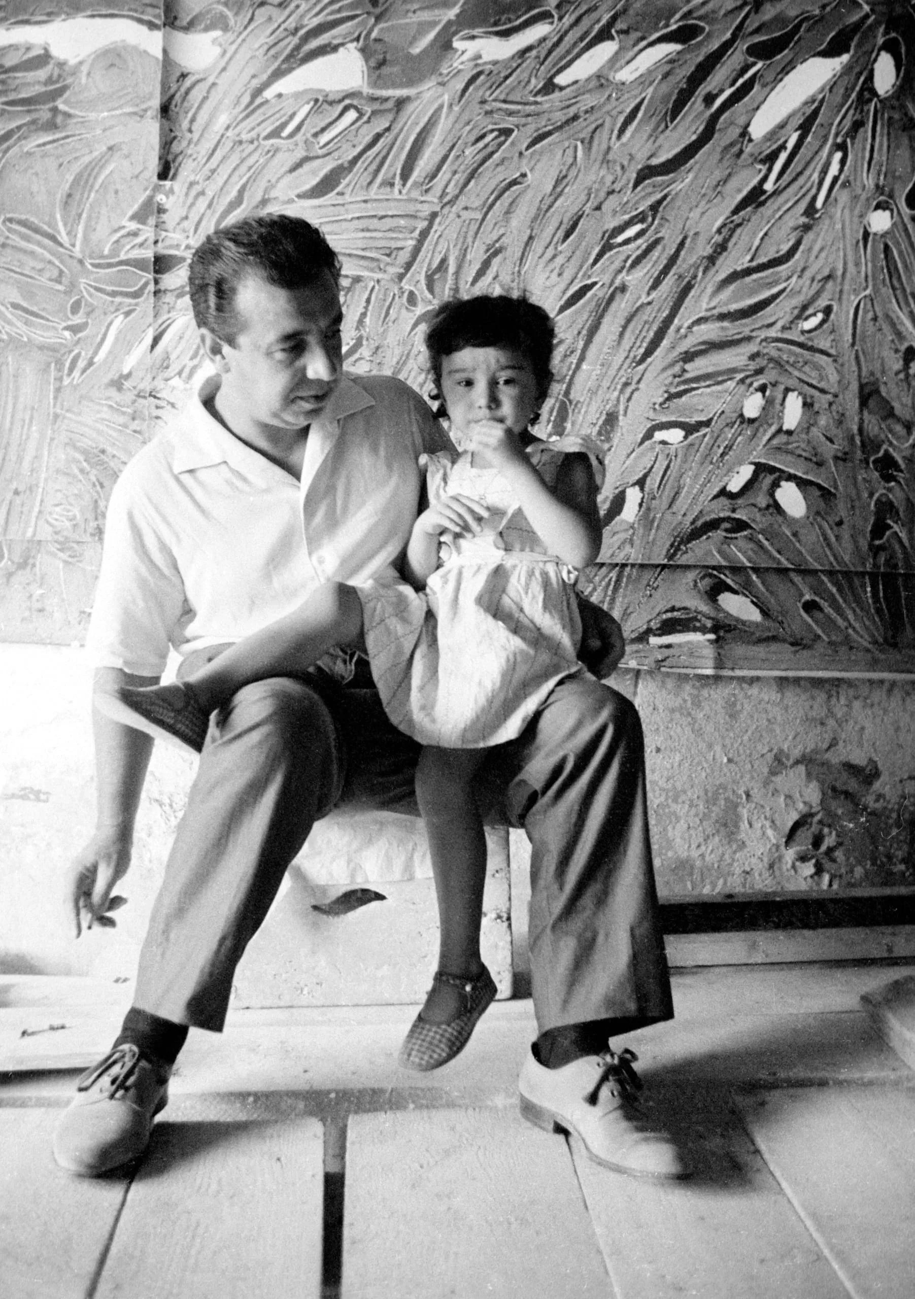 Black and white photograph of a man with short dark hair in a polo shirt seated on a stone ledge, holding a young child on his lap in front of a large textured abstract painting