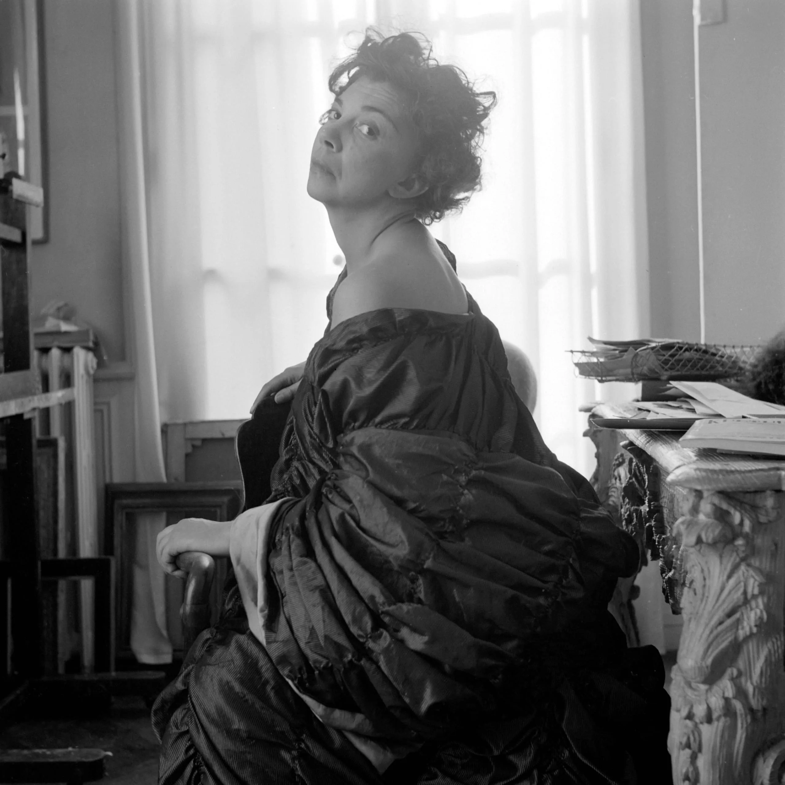 Black and white photograph of a white woman in a dark off-shoulder satin gown, seated and turned to look back over her shoulder, lit by a bright window behind her