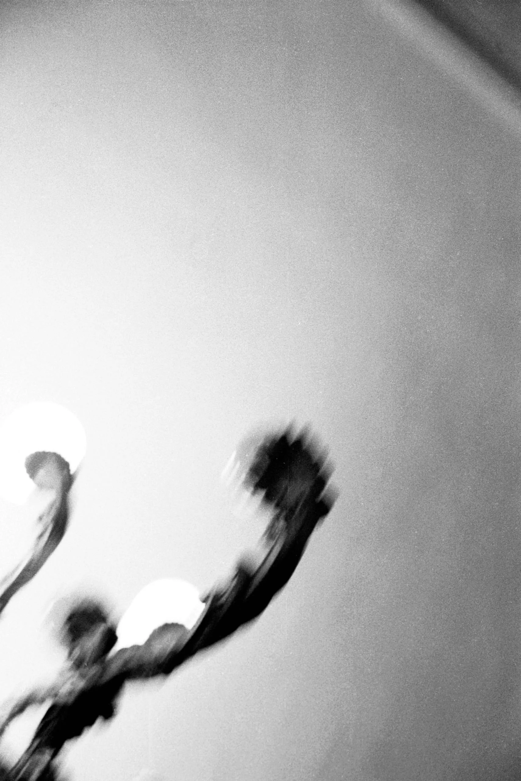 Black and white photograph looking up at a blurred, multi-arm light fixture with two glowing bulbs against a pale gray ceiling, heavy motion blur and coarse grain throughout