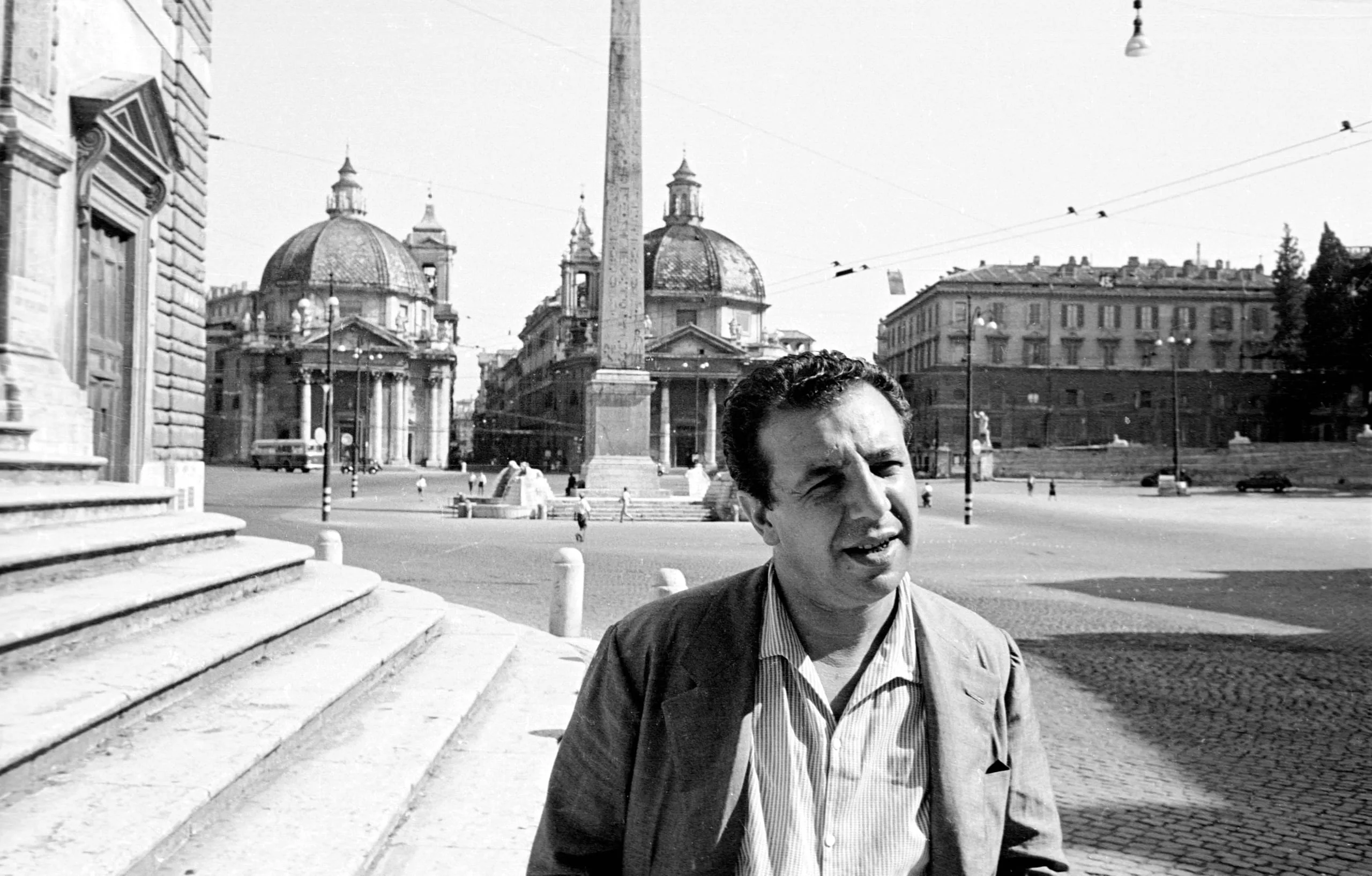 Black and white photograph of a dark-haired man from the chest up, looking left, with a sunlit Italian piazza, obelisk, and two domed Baroque churches behind him