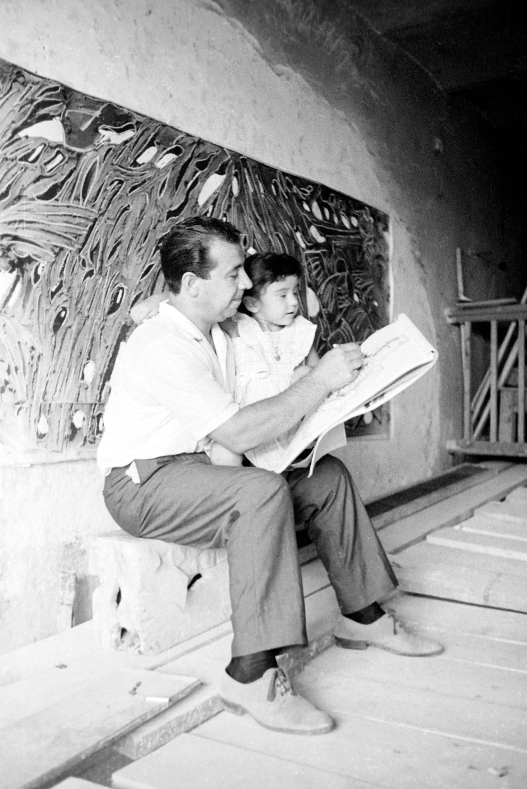 Black and white photograph of a man and young child seated in profile on a stone ledge, the man drawing in a sketchbook, a large abstract painting visible on the wall behind them