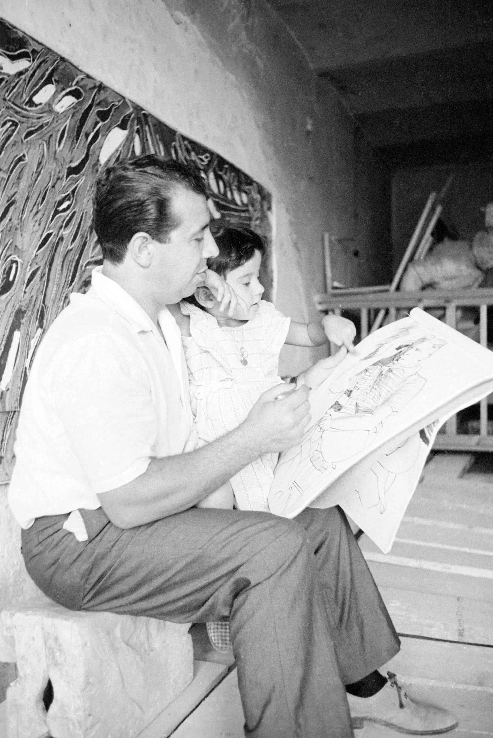 Black and white photograph of a man in profile holding an open sketchbook on his knee, a young child leaning in to touch the page, seated outdoors against a wall with a large relief panel