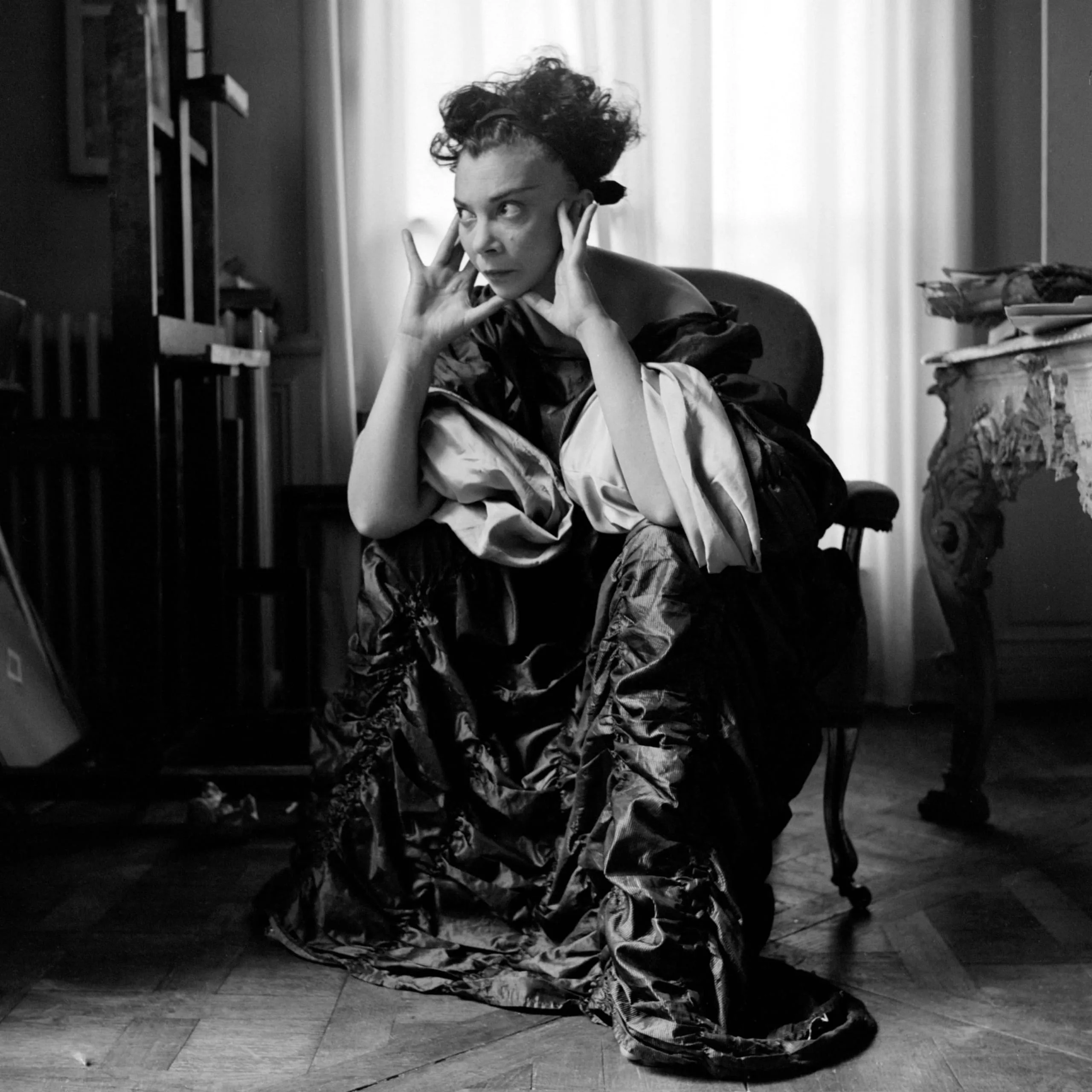 Black and white photograph of a woman in a voluminous satin gown seated on the floor, hands raised near her face, backlit by a curtained window in an artist's studio