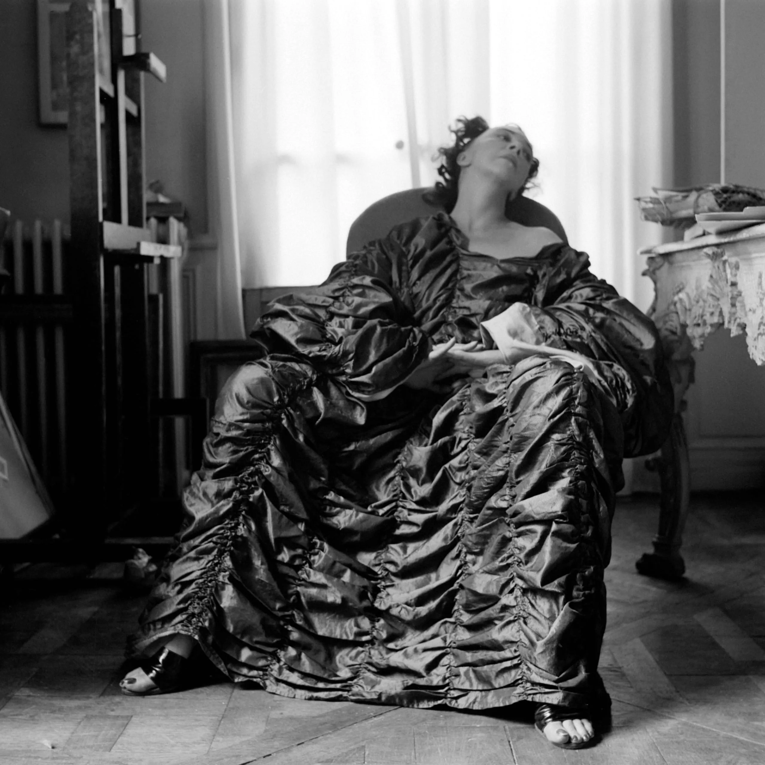 Black and white photograph of a woman in a voluminous, gathered satin gown seated in a chair, head tilted back, eyes closed, in a room with an easel and parquet floor