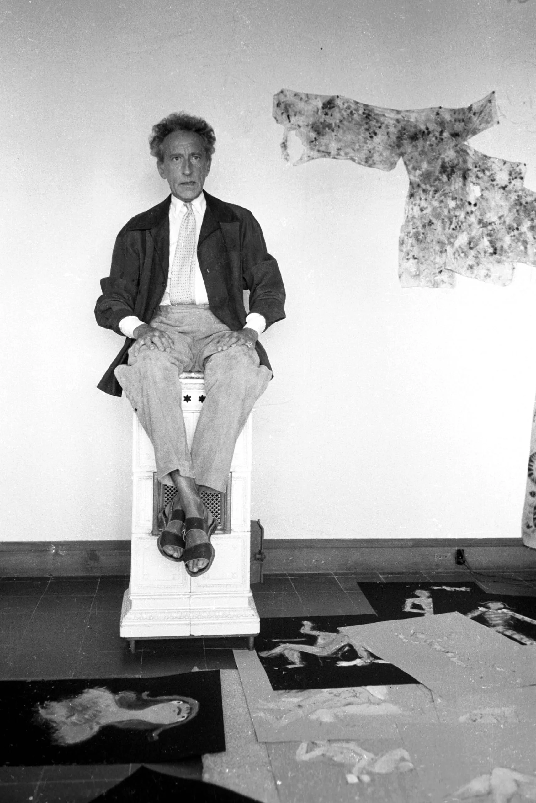 Black and white photograph of a thin older man seated on a white pedestal in an artist's studio, surrounded by works on paper laid on the floor