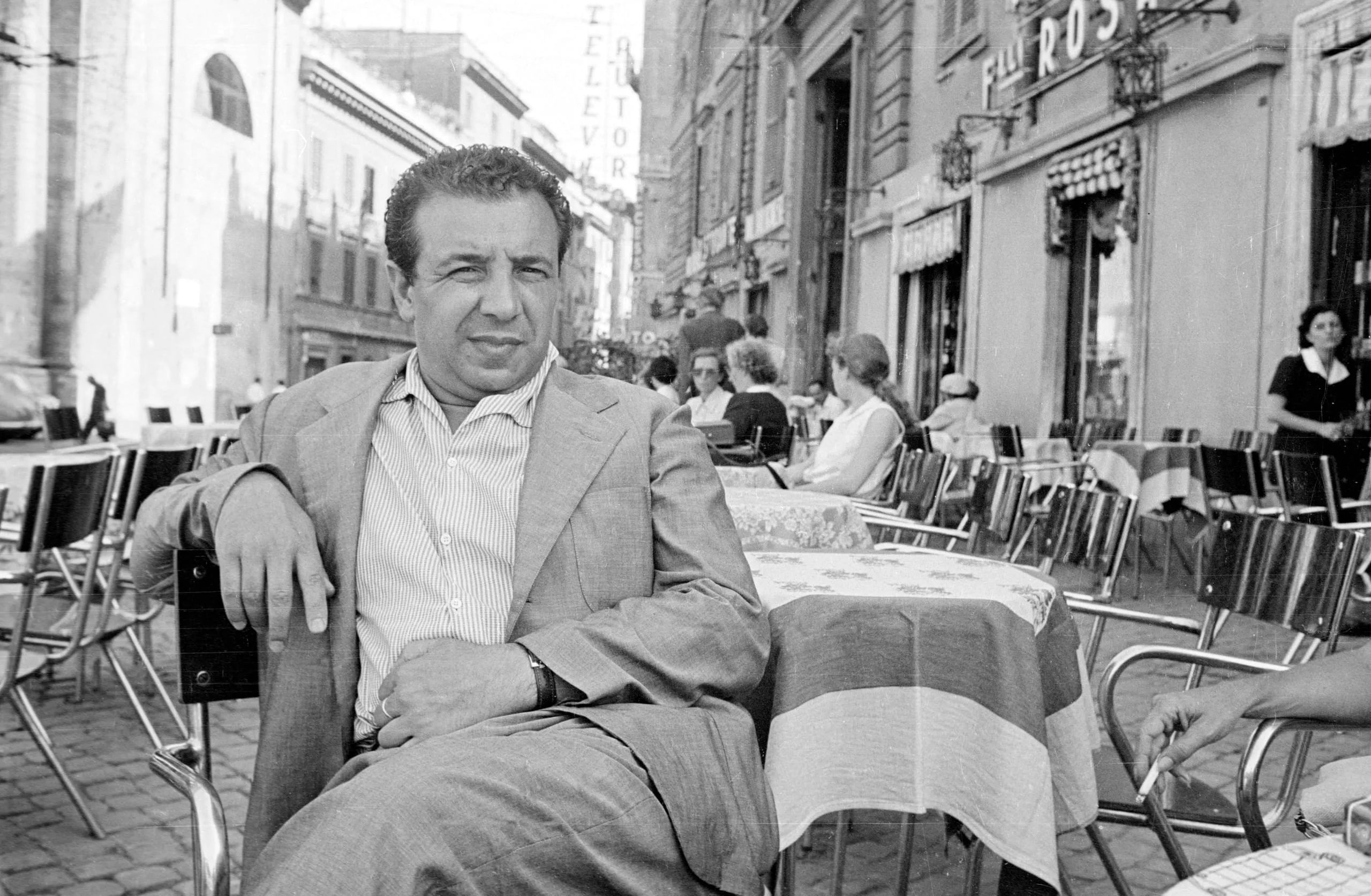 Black and white photograph of a man in a suit jacket seated at an outdoor café table on a city street, looking directly at the camera
