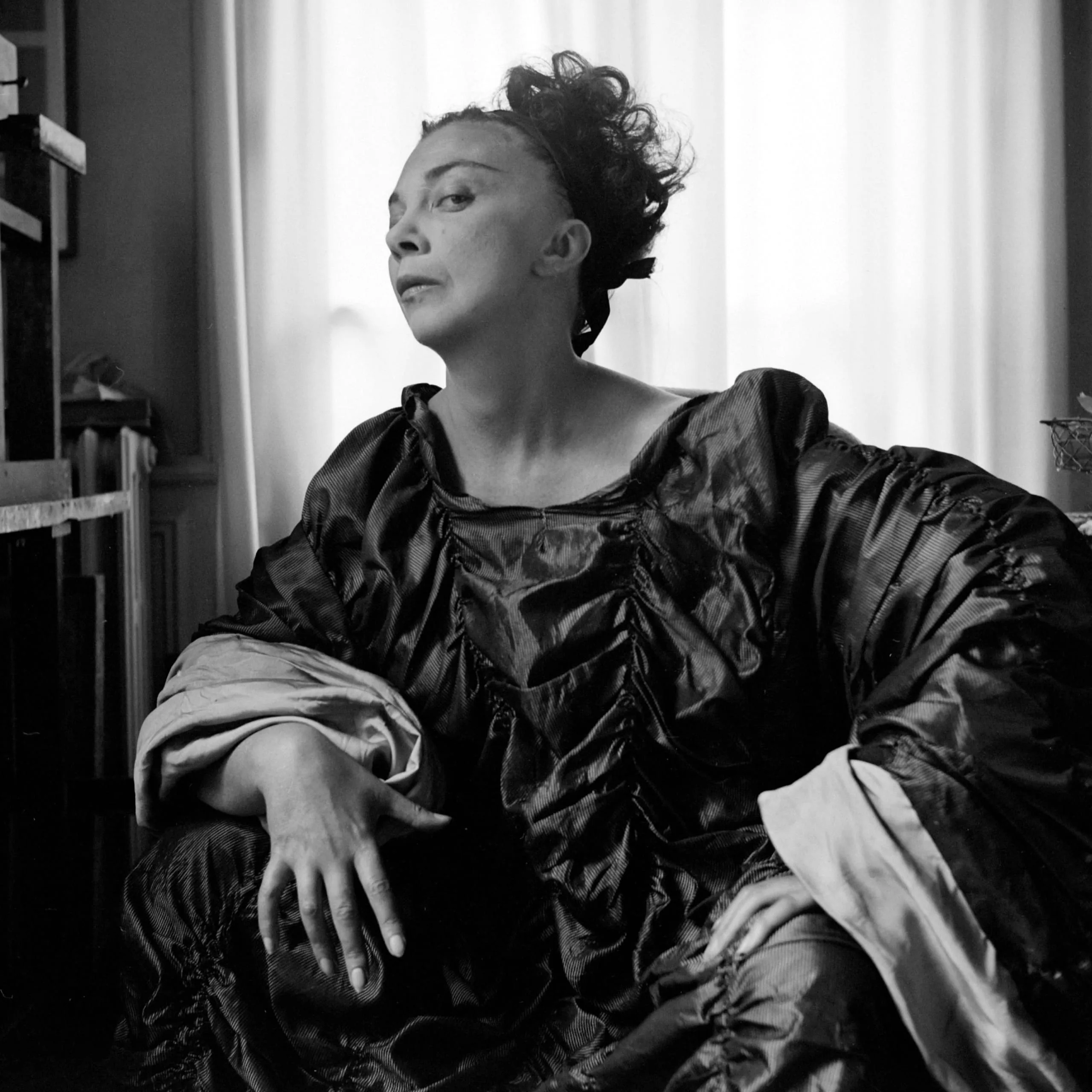 Black and white portrait photograph, a woman seated in three-quarter view wearing a voluminous glossy-fabric gown, soft window light behind her