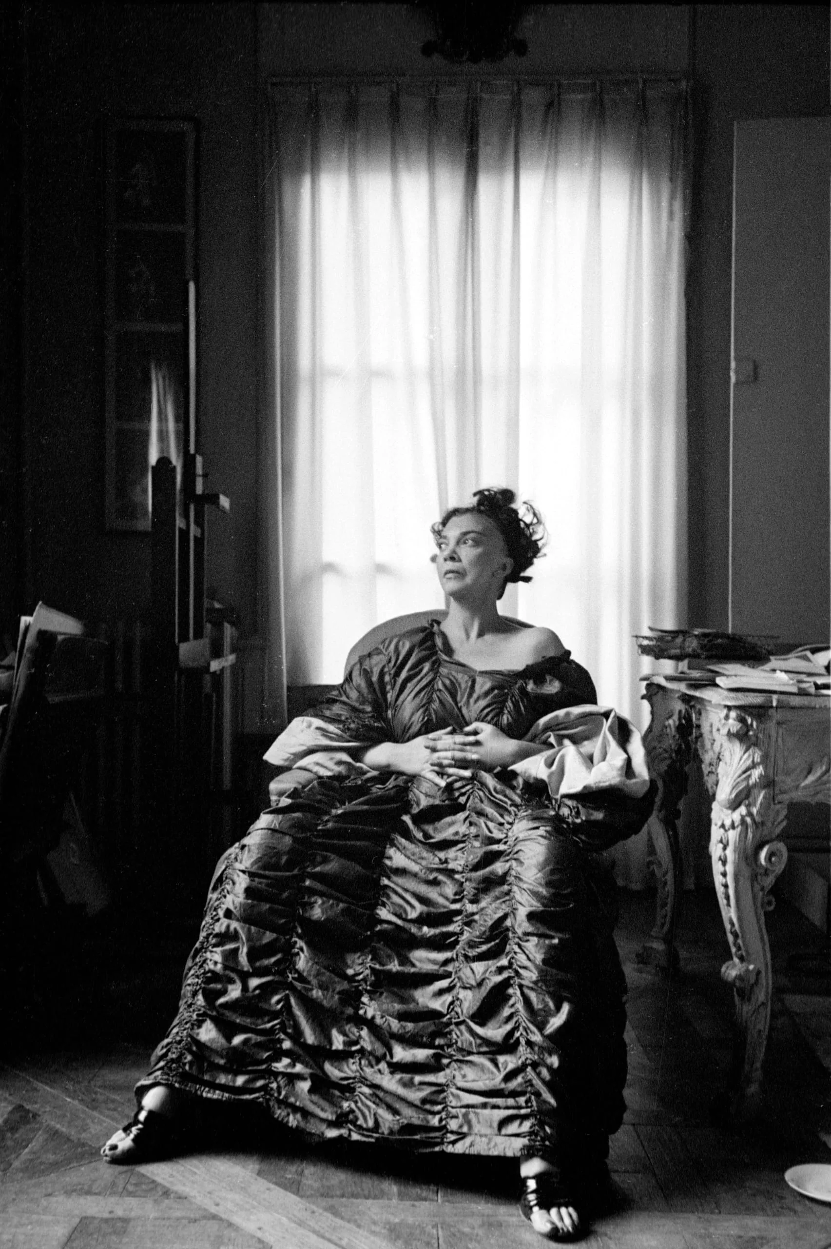 Black and white photograph, full-length portrait of a woman in an off-shoulder ruched satin gown seated in a chair, backlit by a large curtained window