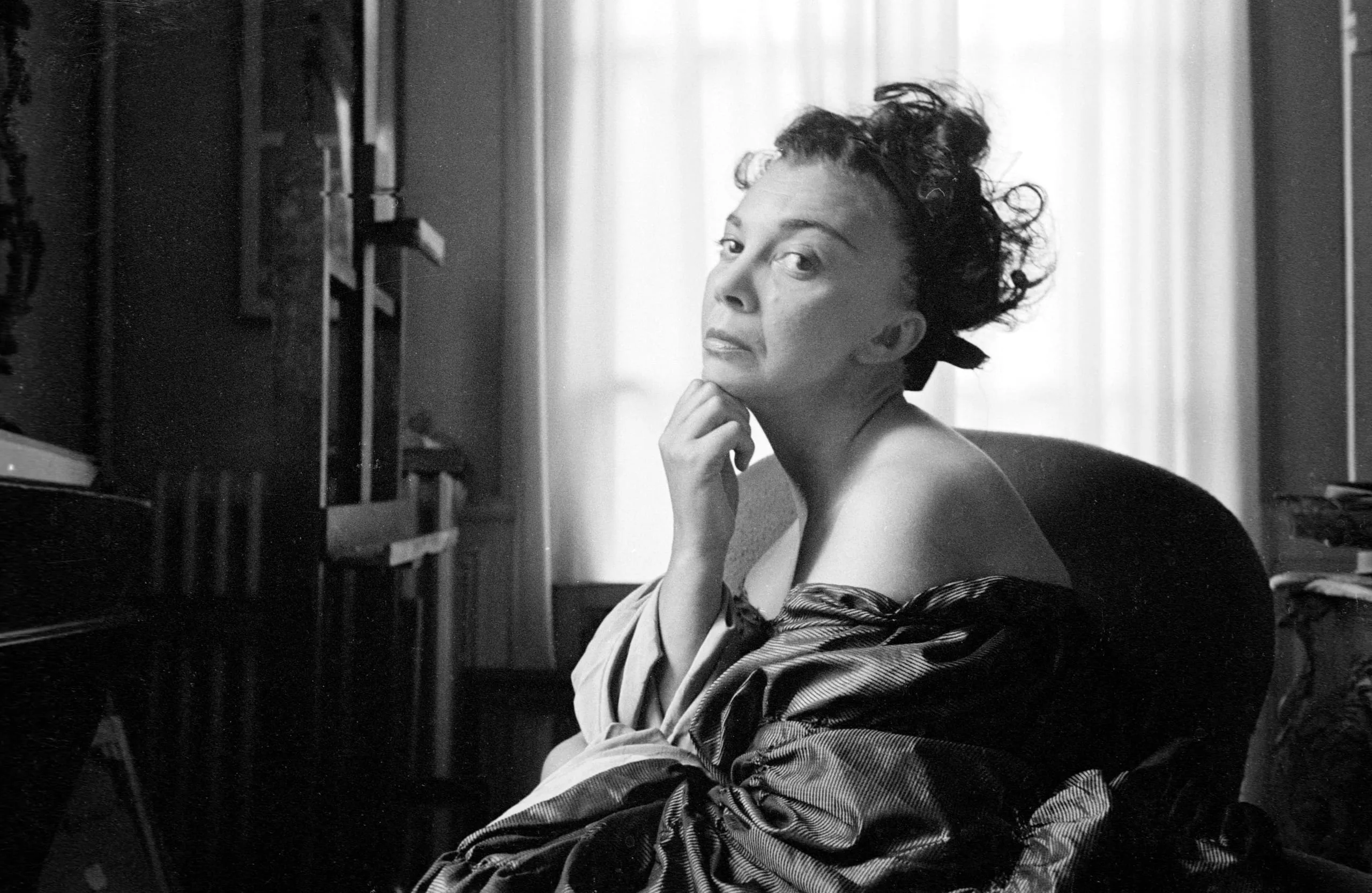 Black and white photograph of a woman seated in an upholstered chair, bare-shouldered in a shiny off-shoulder garment, chin resting on her hand, gazing upward toward soft window light