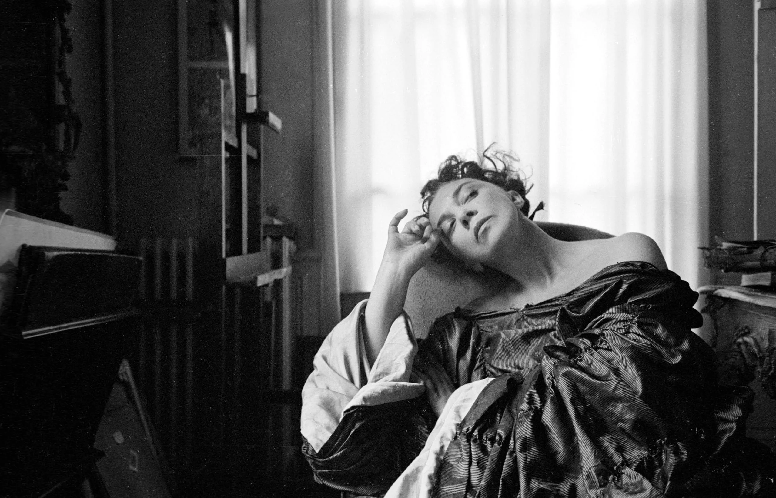 Black and white photograph of a pale-skinned woman reclining in a chair with eyes closed, bare shoulder, draped in dark shiny fabric, backlit by a sheer-curtained window in a cluttered room