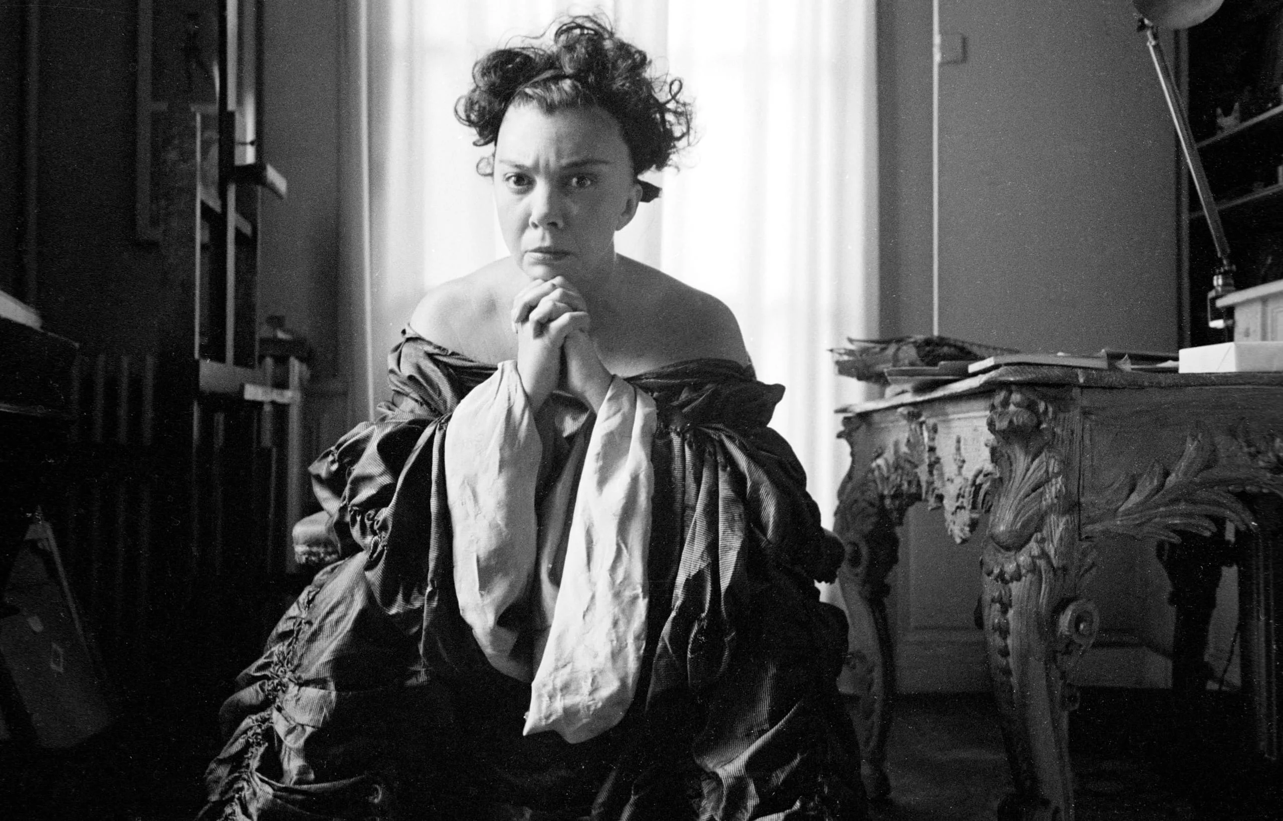 Black and white photograph, woman from the waist up in an off-shoulder period costume, seated with chin resting on clasped hands, soft backlit window behind her