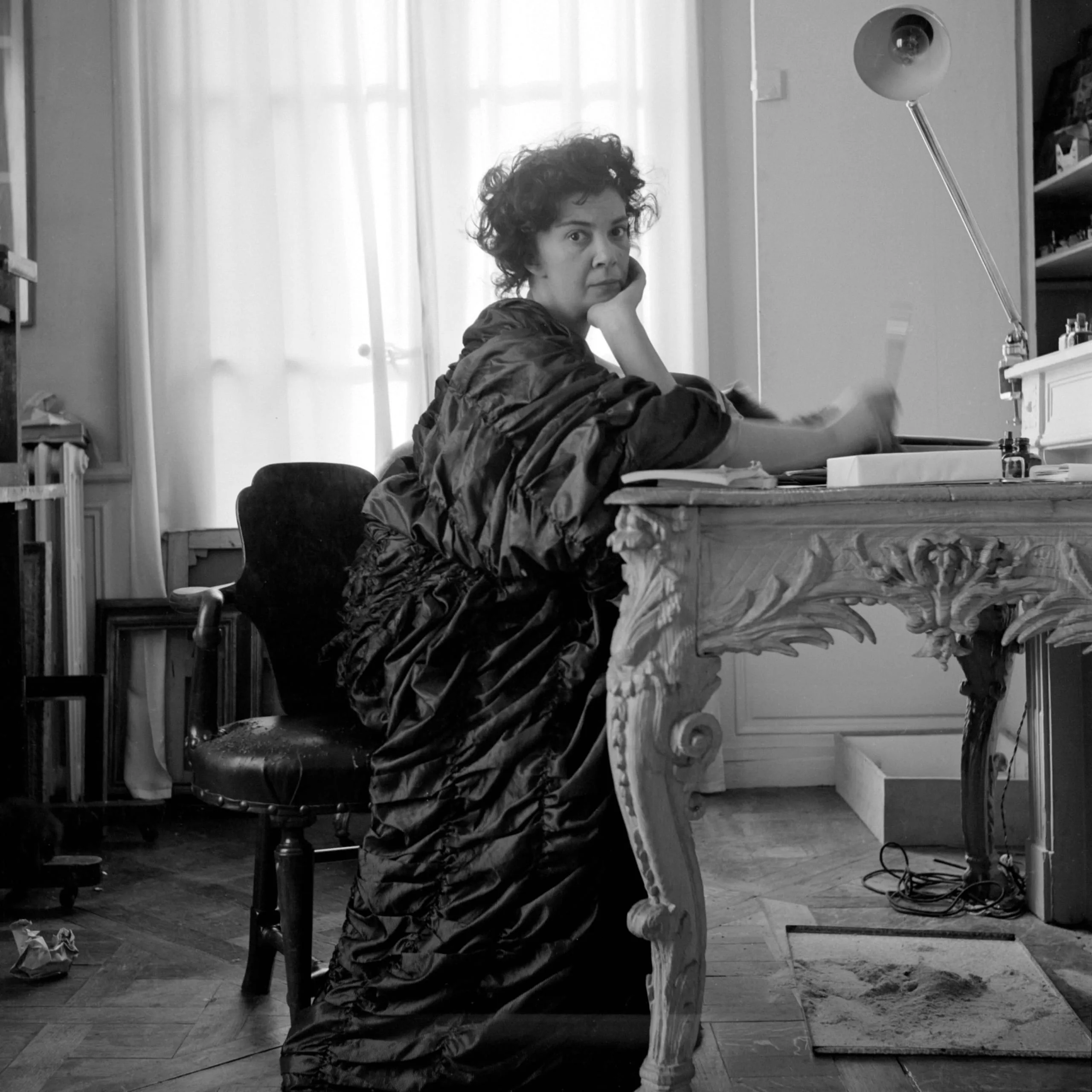 Black and white photograph of a woman in a voluminous dark robe kneeling beside an ornately carved Rococo-style table in an artist's studio, looking back over her shoulder at the camera